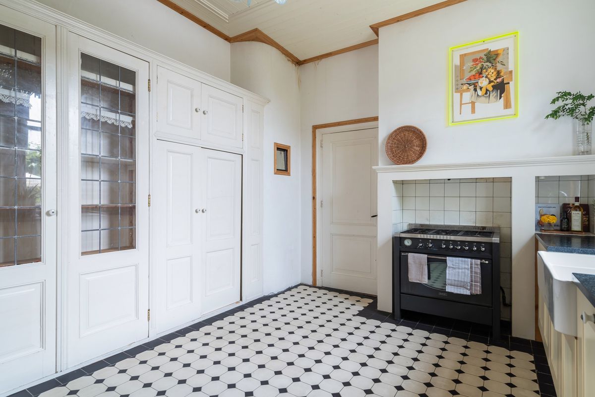 De ruime keuken, bereikbaar via de hal met originele vloertegels, heeft authentieke details zoals Winckelmans vloertegels en wandtegels ("witjes") en biedt volop ruimte om naar eigen smaak te moderniseren.