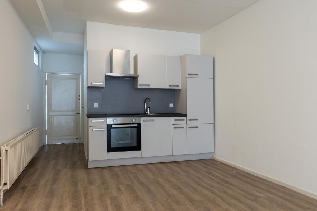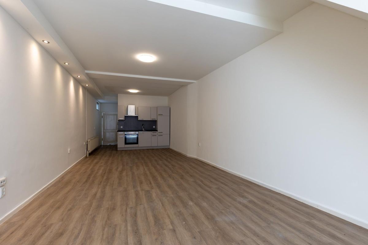 Royale woonkamer met veel lichtinval en een open keuken voorzien van moderne apparatuur: kookplaat, combioven, afzuigkap en koelkast