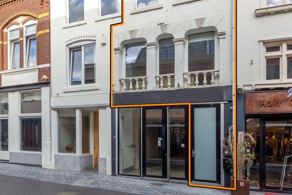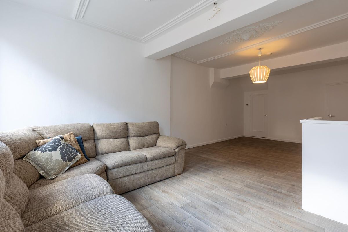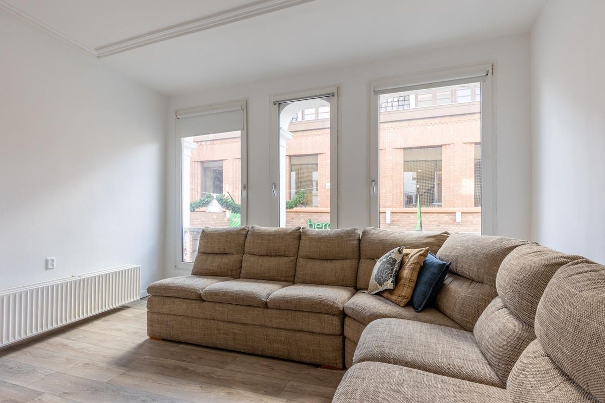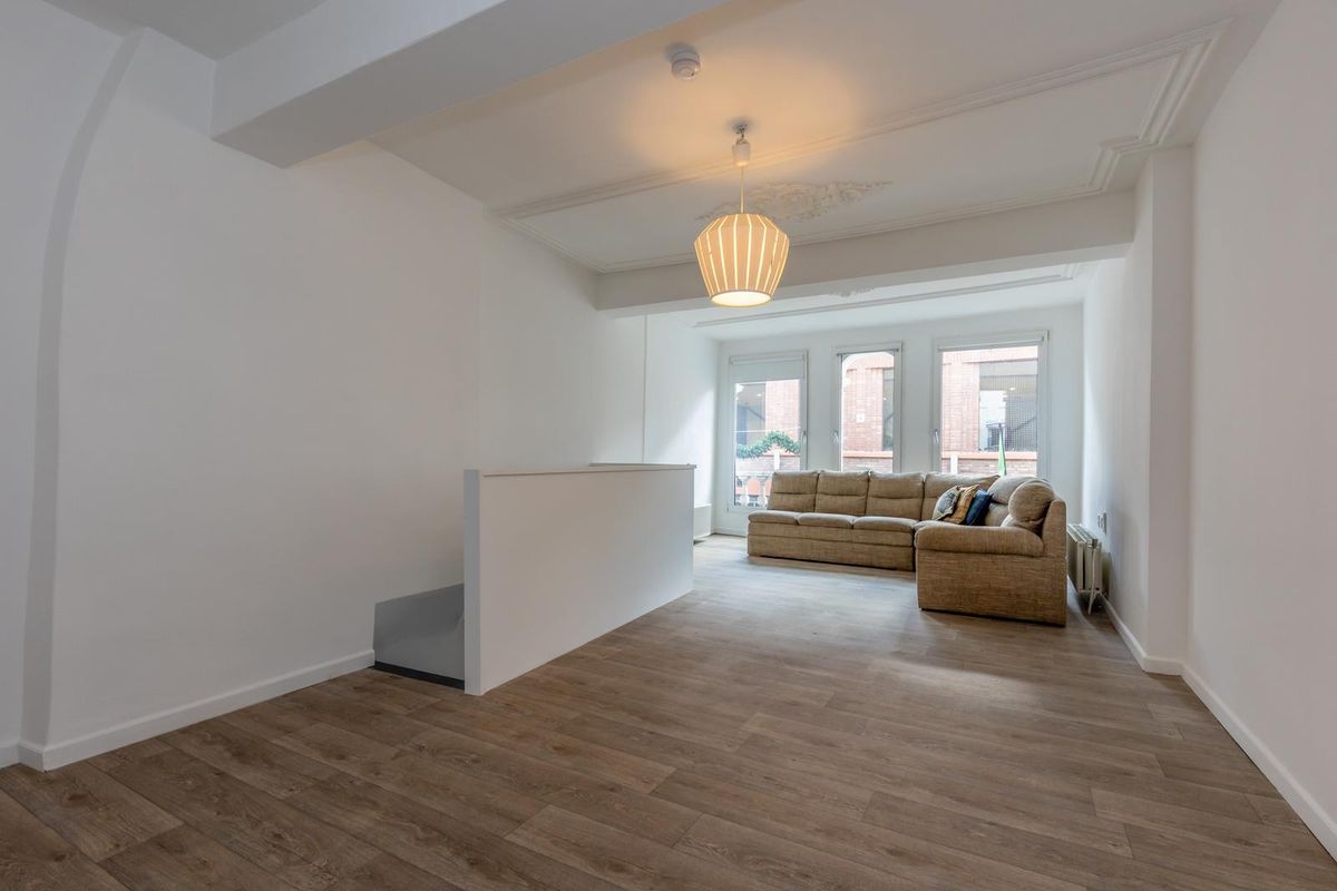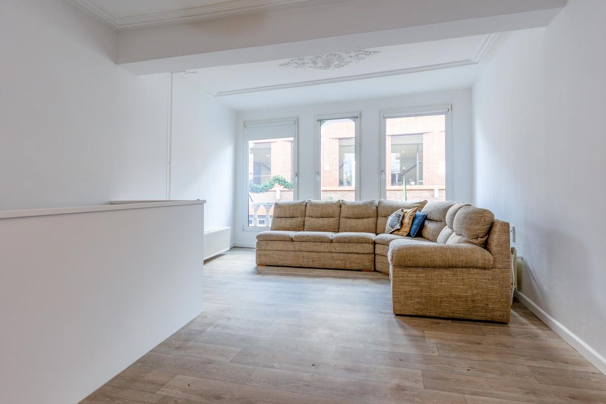Woonkamer (circa32m2) gelegen aan de voorzijde met zicht op de winkelstraat en bergkast onder de trapopgang.