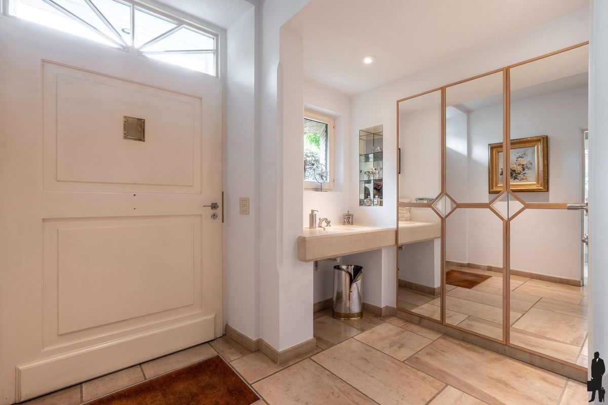 Een ruime, lichtrijke inkomhal met vestiaire en gastentoilet biedt toegang tot het woongedeelte, het trappenhuis en de keuken.