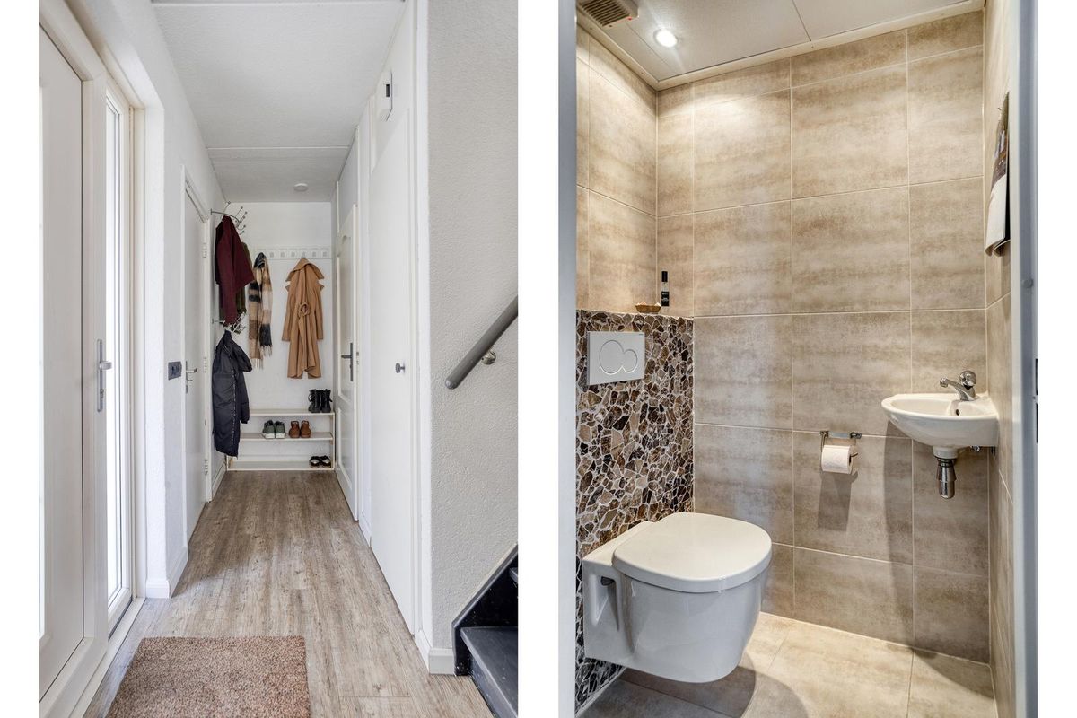 Bij aankomst valt meteen de oprit met parkeergelegenheid voor 2 auto's op eigen terrein op. Via de oprit is de overdekte entree van de woning te bereiken. Vanuit de entree stap je binnen in een lichte hal met garderobehoek, toegang tot de bijkeuken/berging en het moderne wandtoilet met fontein. Vanuit de hal is ook de meterkast, trapopgang naar de 1e verdieping en de woonkamer te bereiken.
