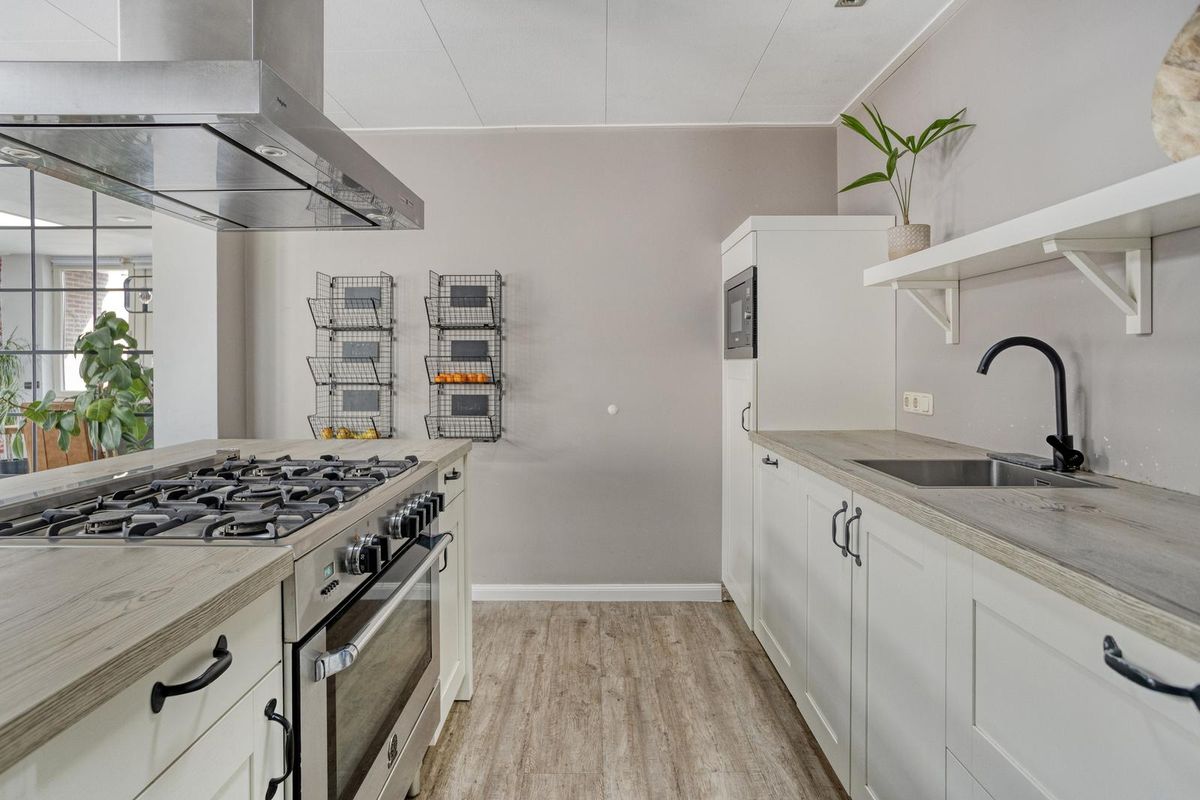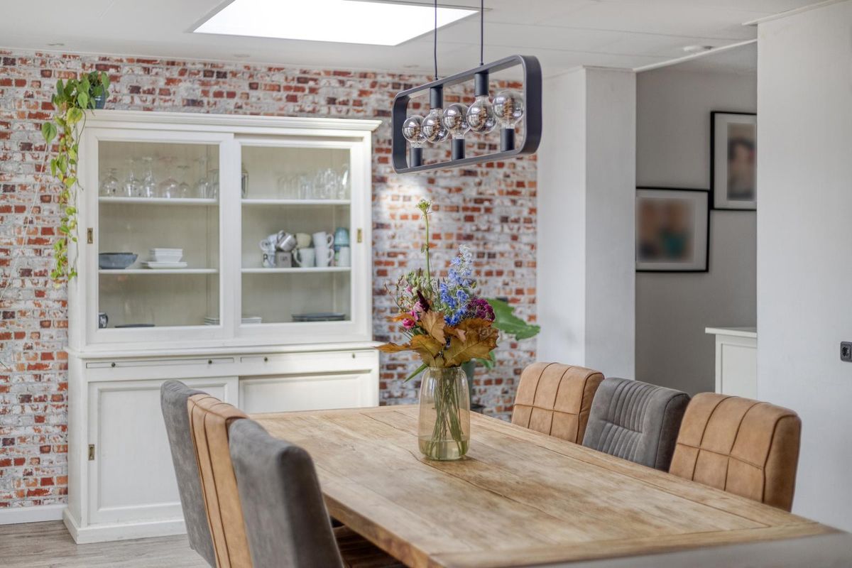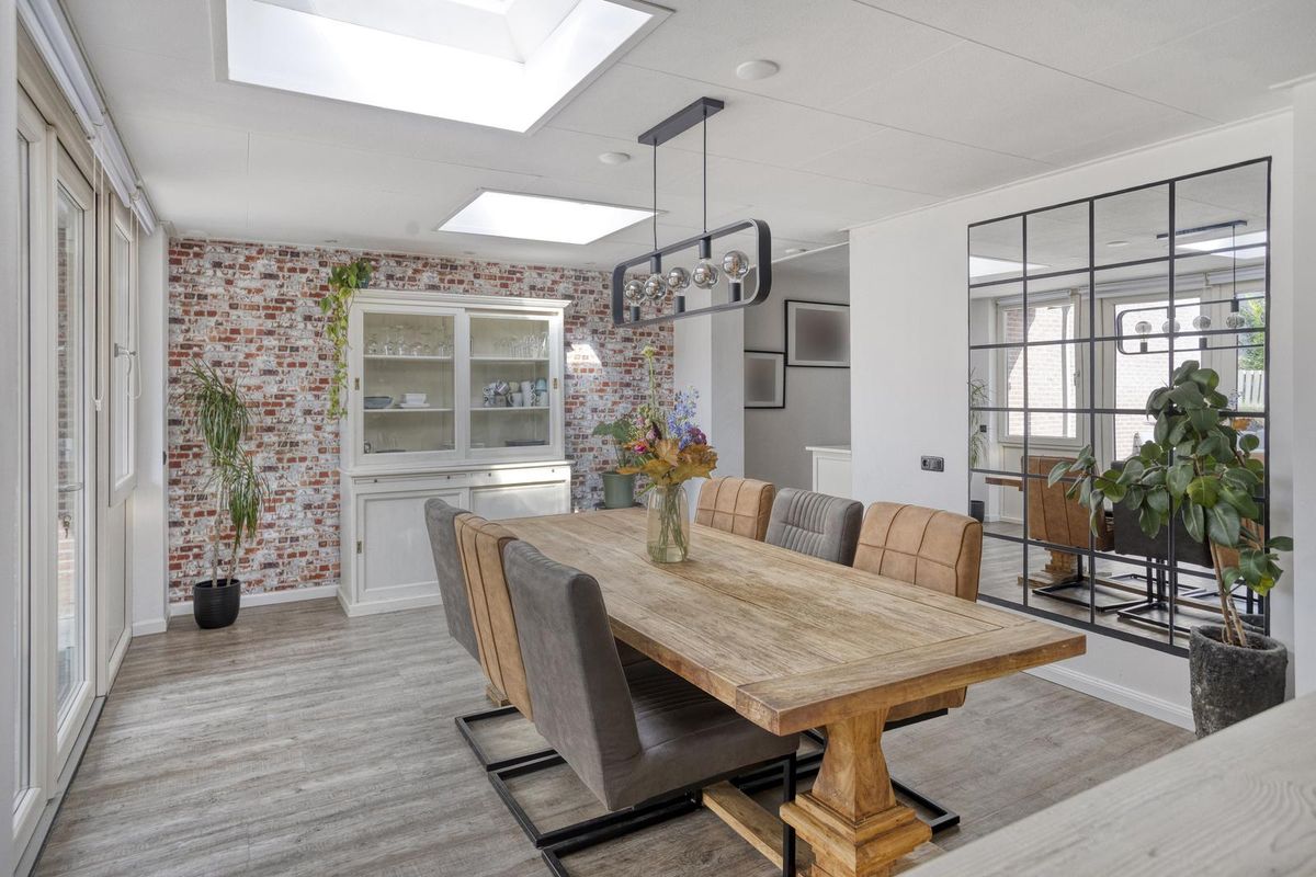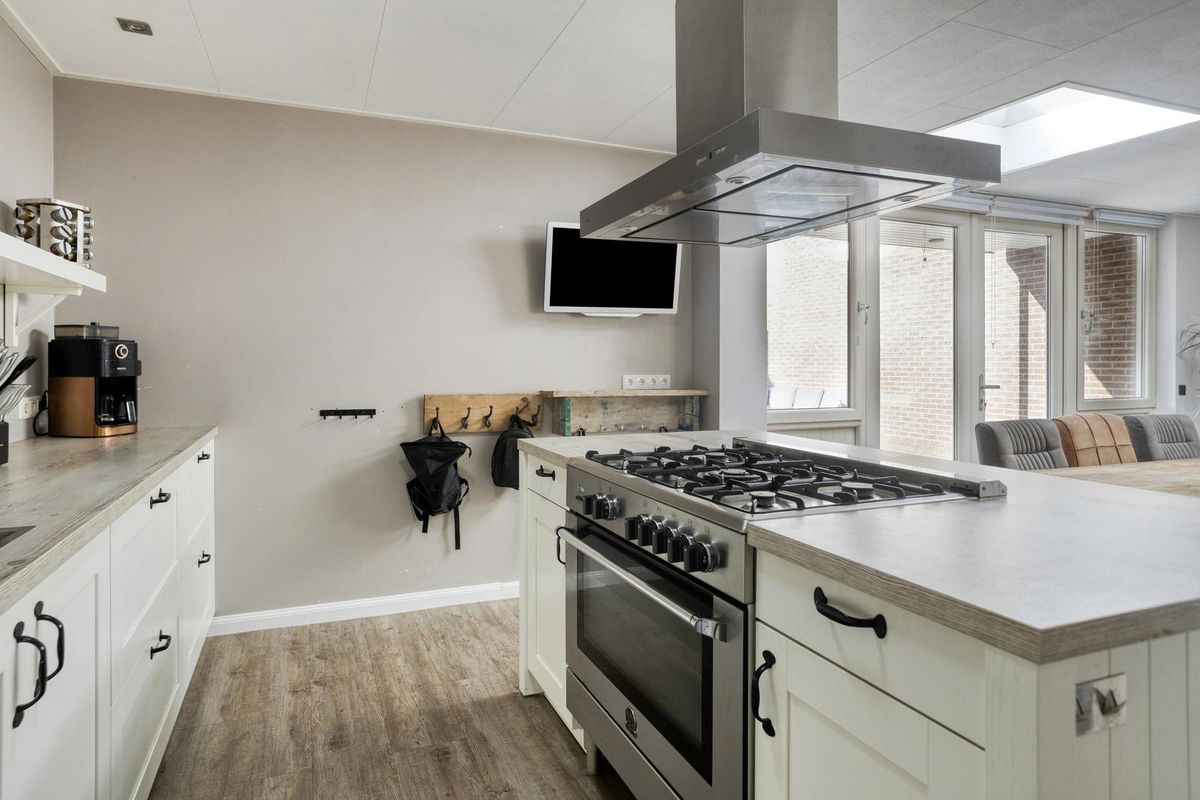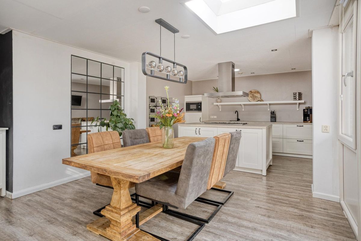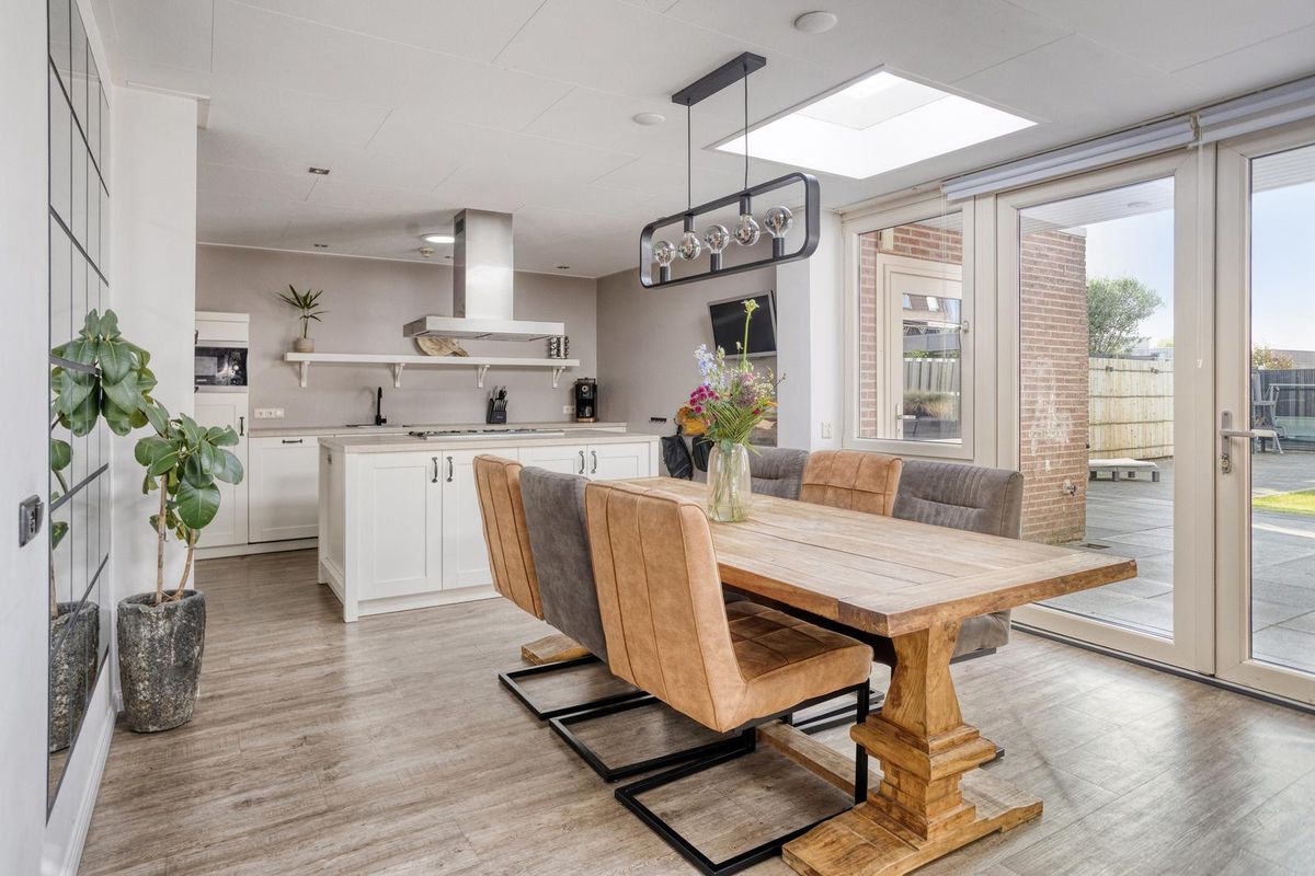 De half-open keuken is aan de achterzijde van de woning gelegen. huis. Dankzij de brede uitbouw aan de achterzijde geniet je hier van extra leefruimte en een prachtige lichtinval door de grote raampartijen en lichtkoepels. Tevens zijn er in de achtergevel openslaande deuren naar het zonneterras geplaatst. Het betreft hier een echte woonkeuken met ruimte voor een grote eettafel waar het hele gezin kan samenkomen.