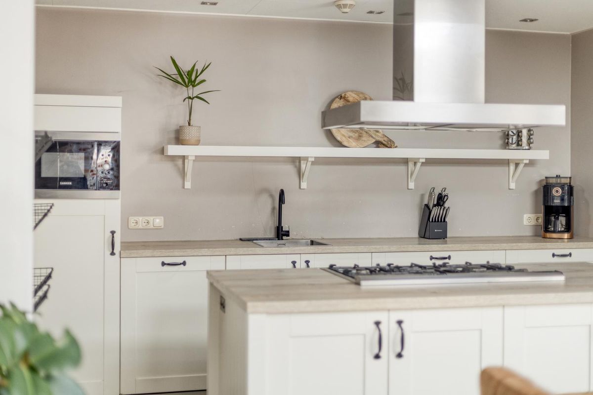 De lichte keuken is in een rechte opstelling geplaatst, hier is ook het spoelgedeelte aanwezig. Koken gaat via het moderne kookeiland. De keuken is voorzien van de navolgende inbouwapparatuur: Koelkast, oven, vaatwasser, afzuigschouw en een groot fornuis met 5-pits gaskookplaat en een brede oven.