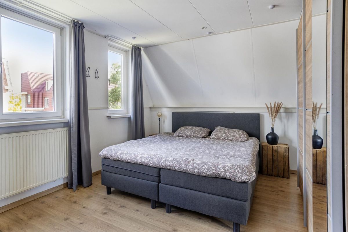 Via de trapopgang vanuit de hal is de 1e verdieping te bereiken. Overloop, slaapkamer (circa 16 m2) aan de voorzijde van de woning, 2e slaapkamer van circa 10 m2 aan de achterzijde van de woning. Vanuit deze slaapkamer is er een toegang naar het platte dak boven de uitbouw.