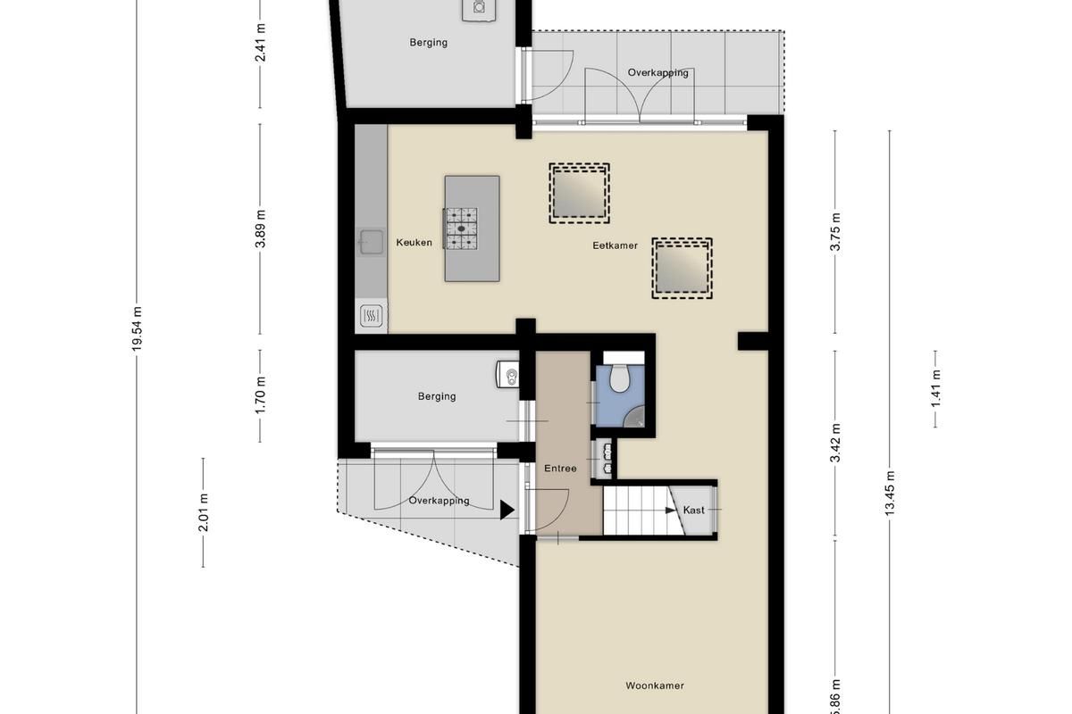 Begane grond: Overdekte entree, hal met trapopgang naar de 1e verdieping en toegang naar de bijkeuken/berging, wandtoilet met fontein, meterkast, woonkamer met vaste trapkast, half-open keuken met openslaande deuren naar het terras.