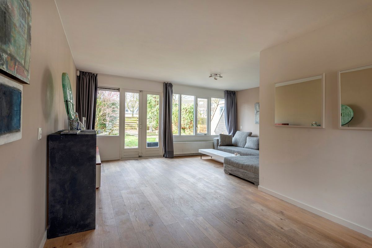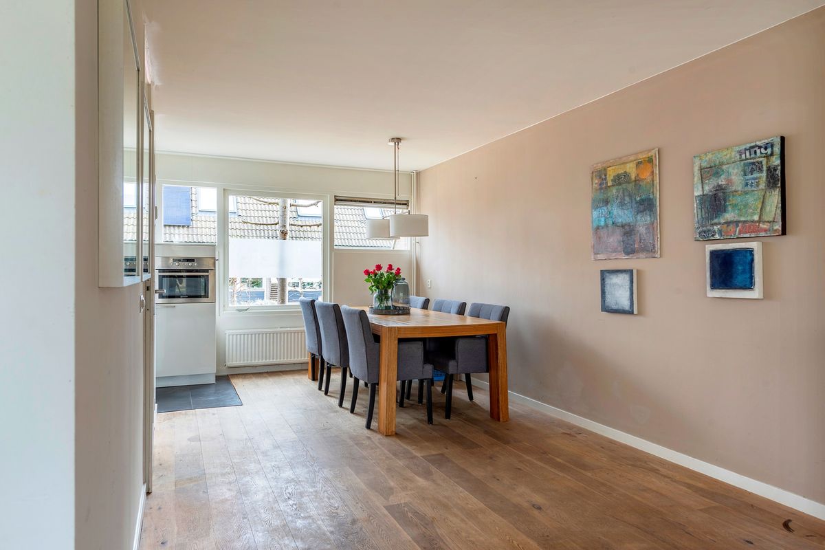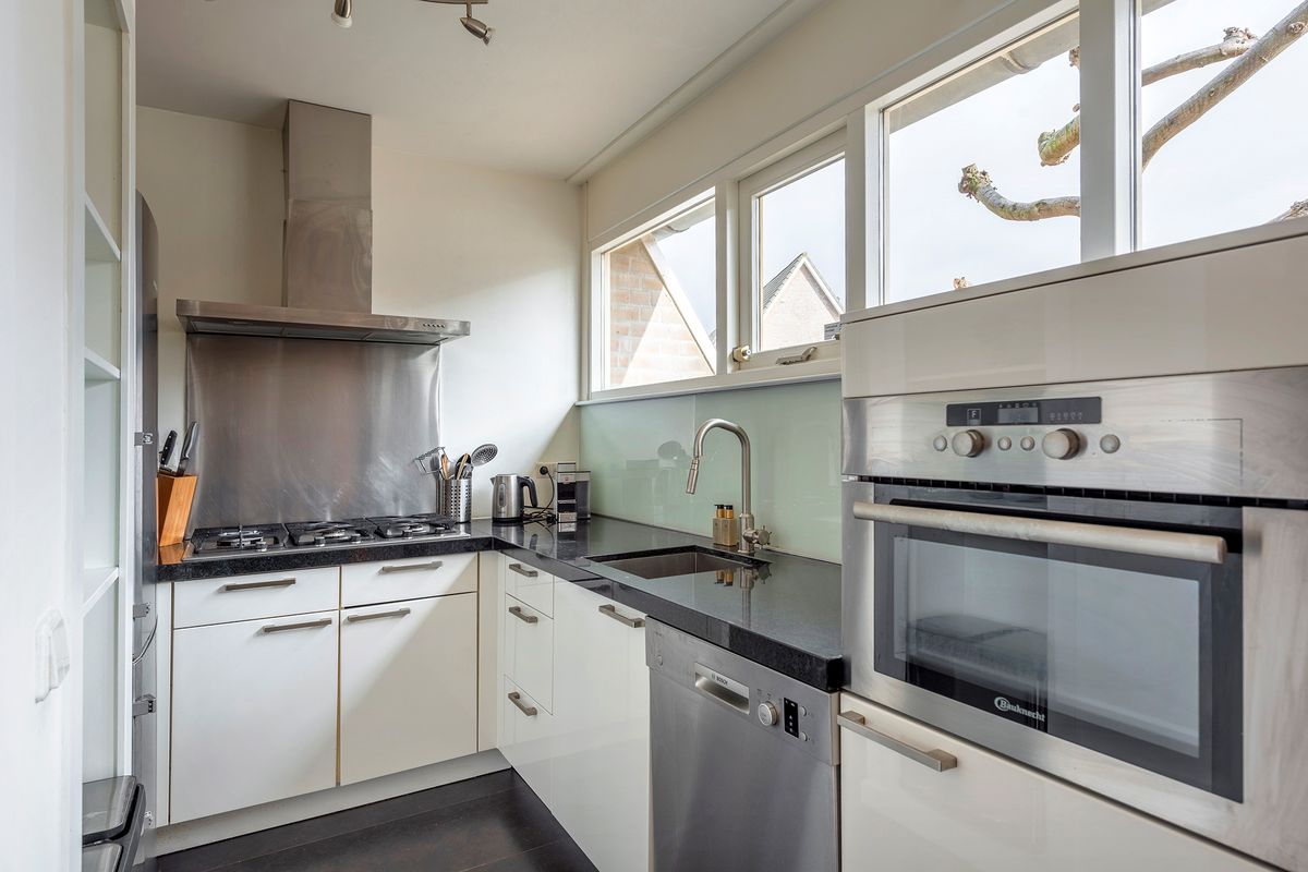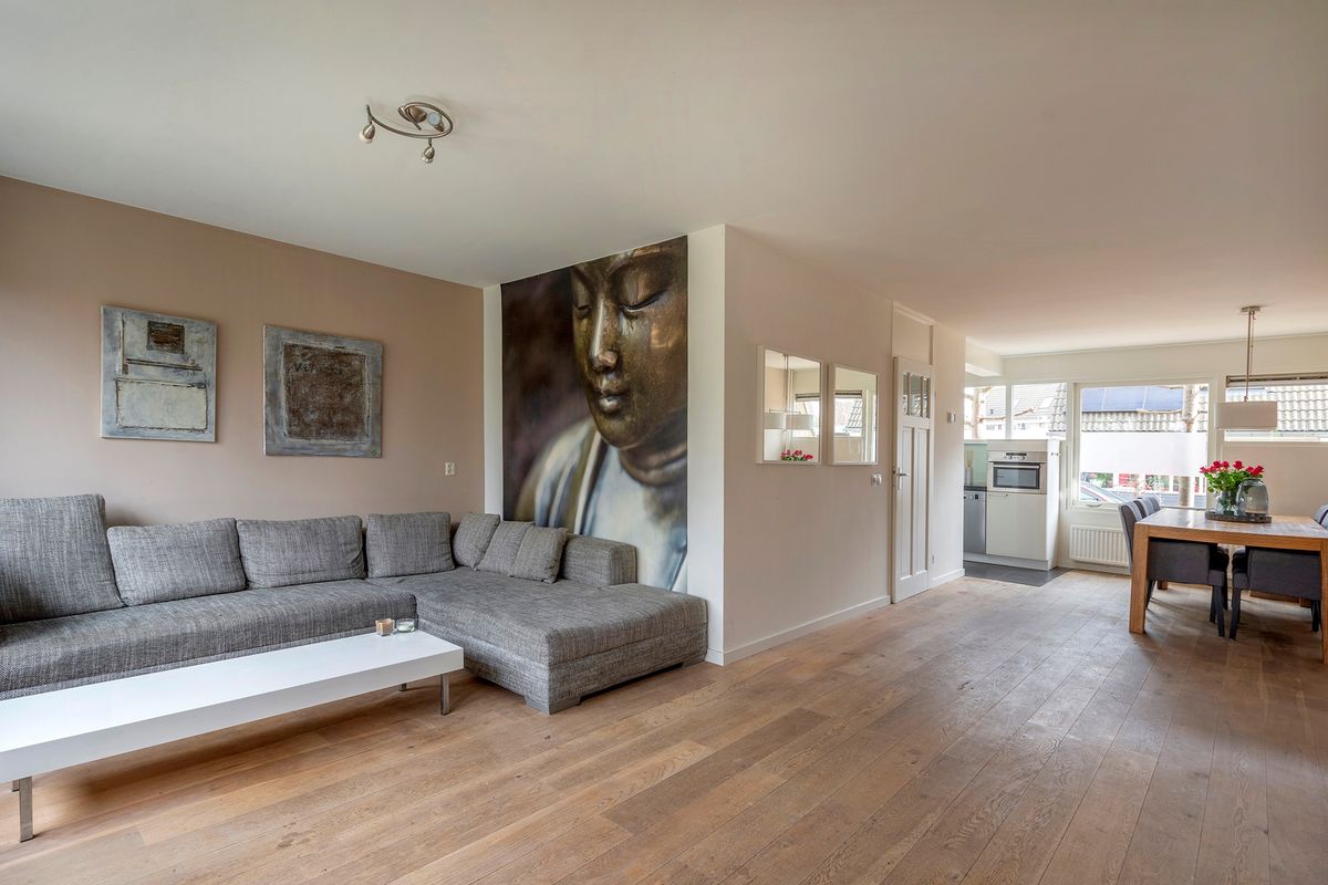 INDELING: entree onder de carport, hal, meterkast, toilet met fonteintje, L-vormige, tuingerichte woonkamer (ca. 35 m2) met openslaande terrasdeuren naar de achtergelegen tuin. De vloer is afgewerkt met fraaie eiken vloerdelen (zwevend gelegd). De compacte keuken is aan de voorzijde van de woning gelegen en beschikt over een nette, witte keukenopstelling met een zwart granieten werkblad en complete (inbouw-)apparatuur, waaronder een 5-pits gaskookplaat met RVS afzuigschouw, een losse vaatwasser en koelkast en een combimagnetron.