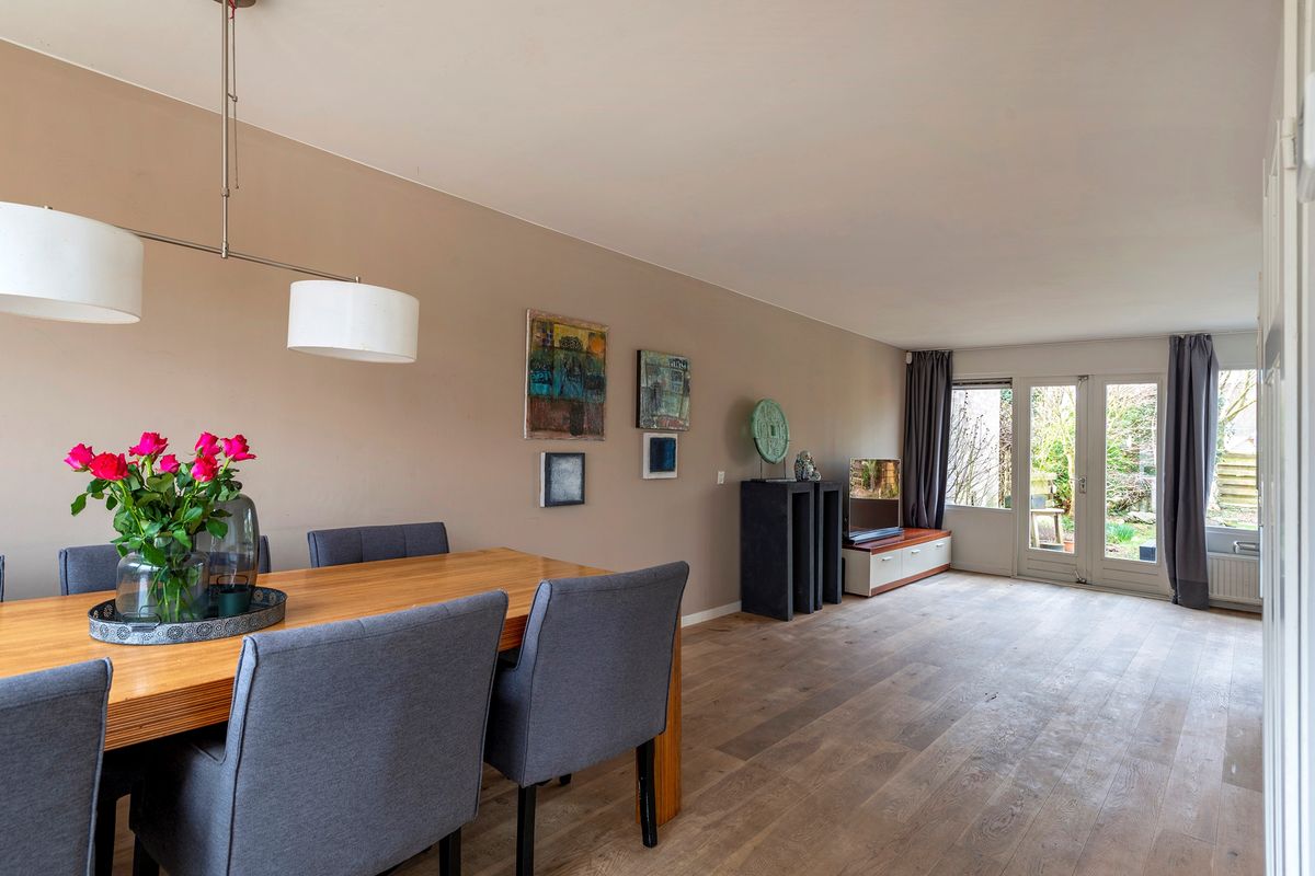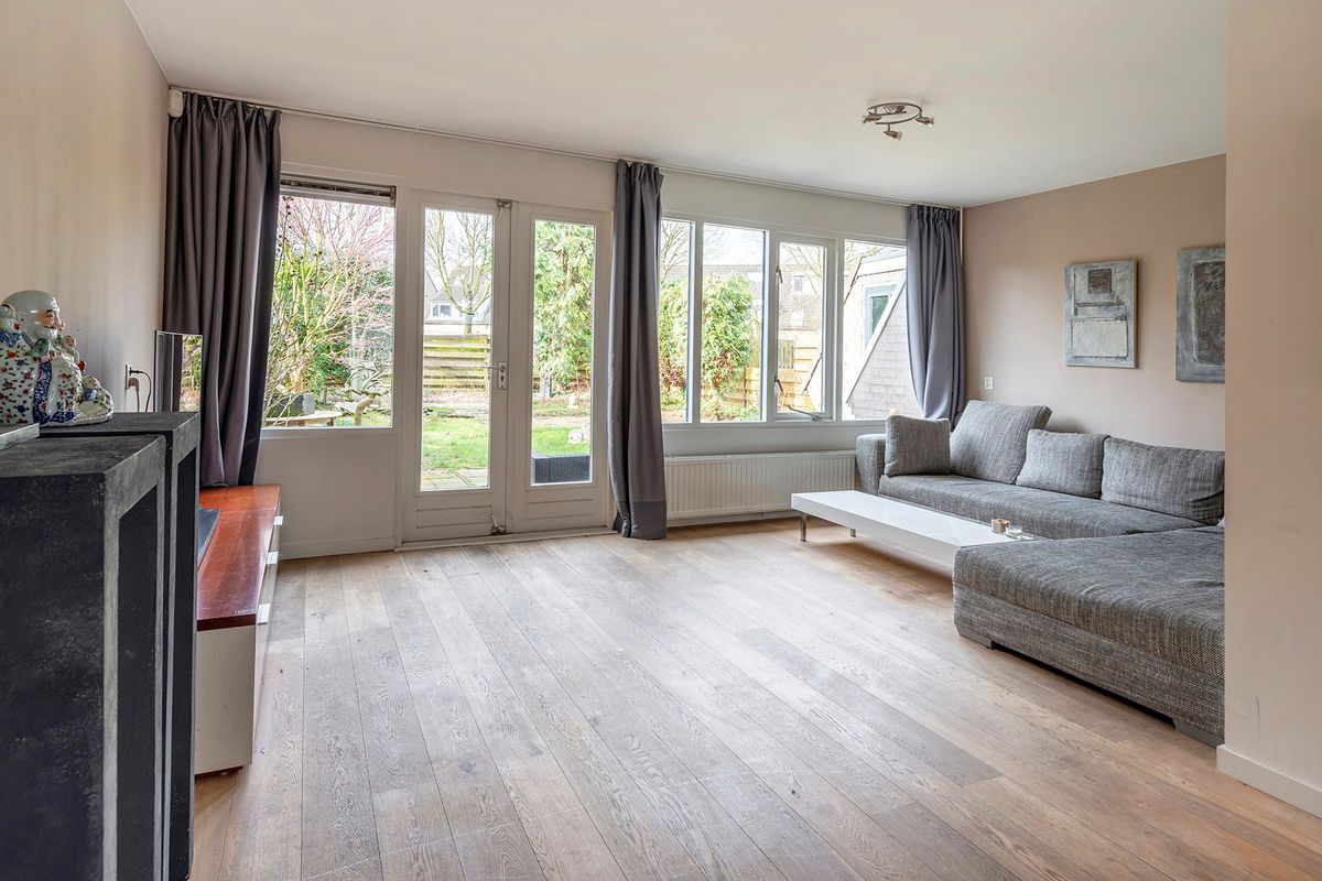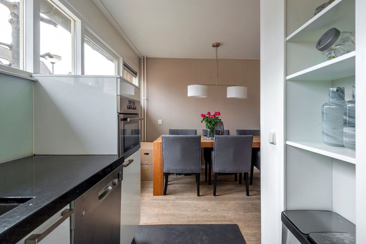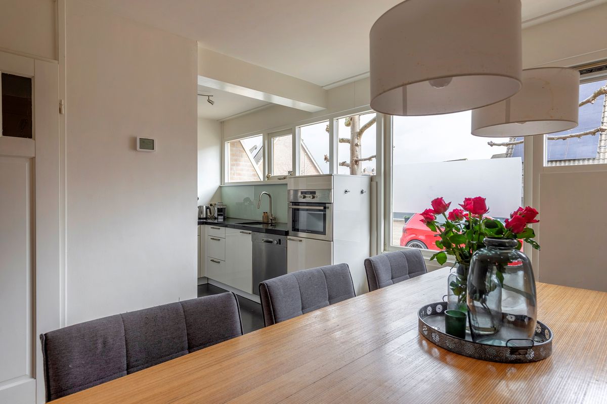 INDELING: entree onder de carport, hal, meterkast, toilet met fonteintje, L-vormige, tuingerichte woonkamer (ca. 35 m2) met openslaande terrasdeuren naar de achtergelegen tuin. De vloer is afgewerkt met fraaie eiken vloerdelen (zwevend gelegd). De compacte keuken is aan de voorzijde van de woning gelegen en beschikt over een nette, witte keukenopstelling met een zwart granieten werkblad en complete (inbouw-)apparatuur, waaronder een 5-pits gaskookplaat met RVS afzuigschouw, een losse vaatwasser en koelkast en een combimagnetron.