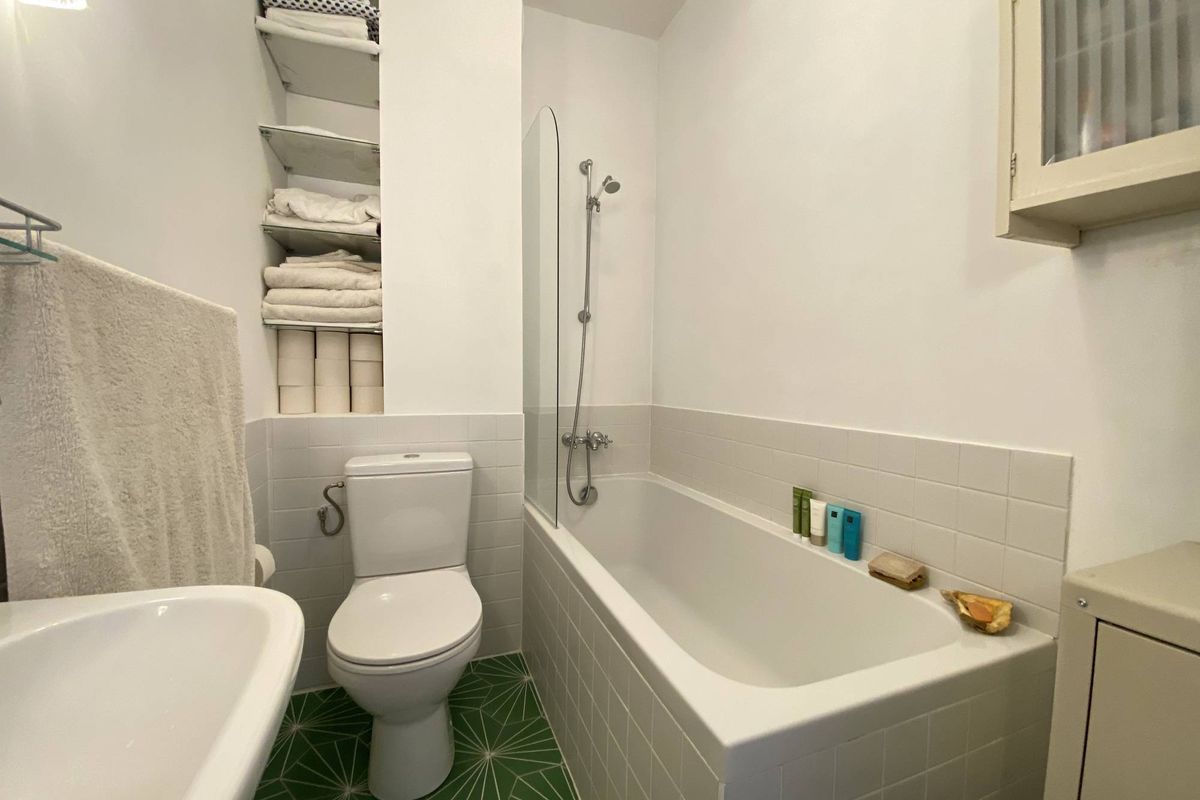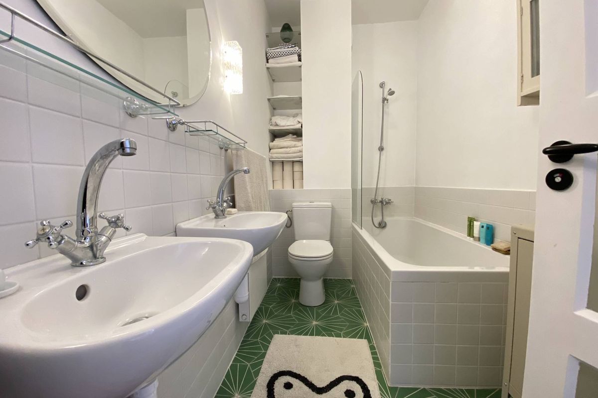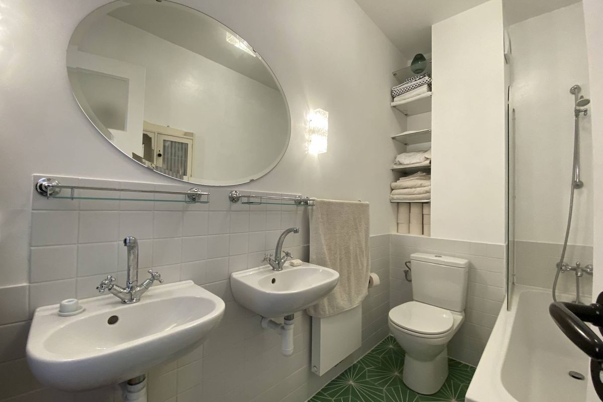 Twee slaapkamers, een van 20m2 en een kleinere slaapkamer met een eenpersoonsbed, een wasruimte en een badkamer met een bad/douche, dubbele wastafel en een toilet.