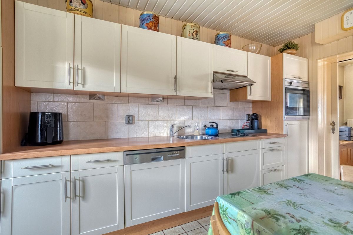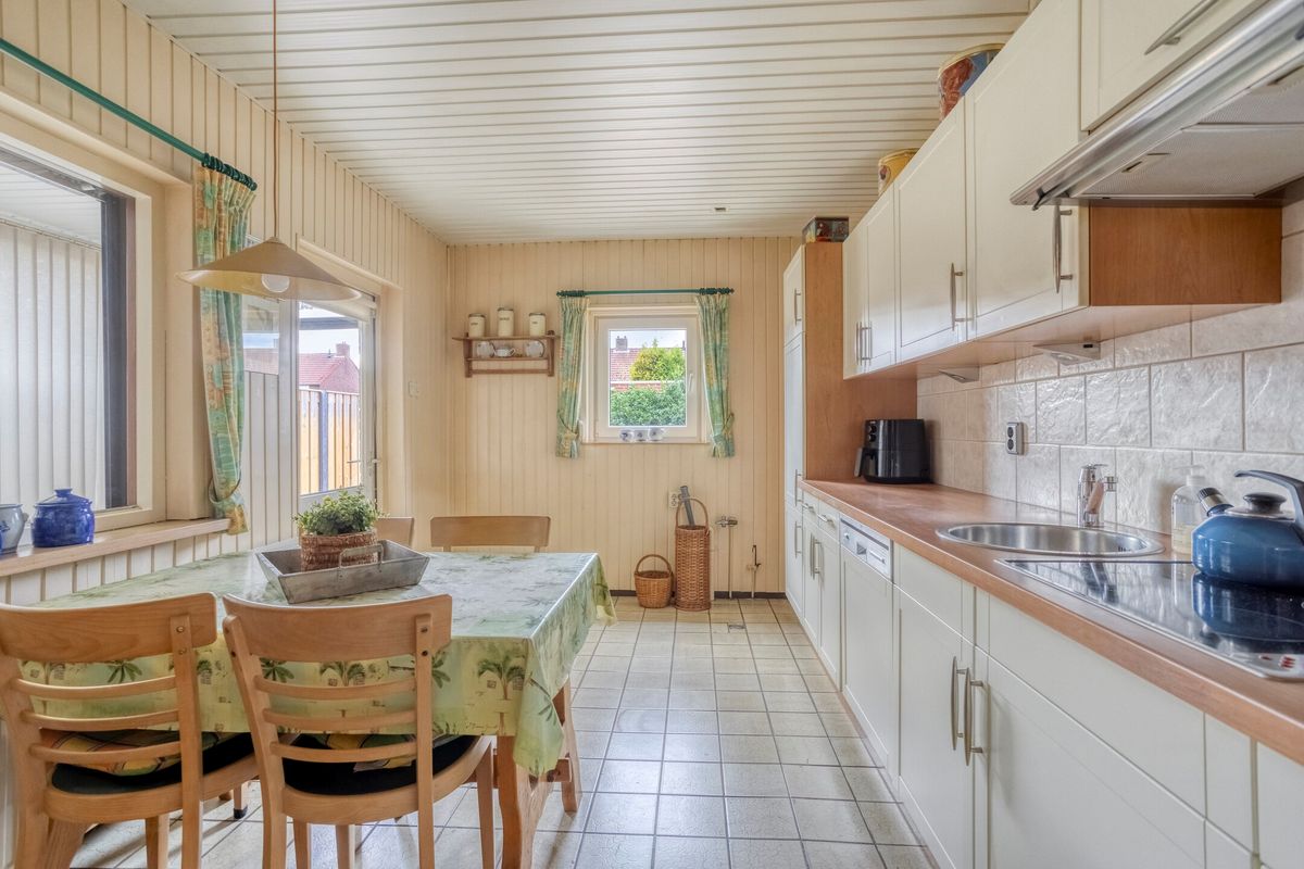 De keuken (ca. 13 m²) is voorzien is van een tegelvloer en een keukenopstelling met apparatuur (elektrische kookplaat, afzuigkap, oven, vaatwasser en koelkast) en beschikt over voldoende werk- en kastruimte. Vanuit de keuken is er toegang tot de serre (ca. 11 m²). De serre is voorzien van een inbouwkast en een loopdeur naar de tuin.