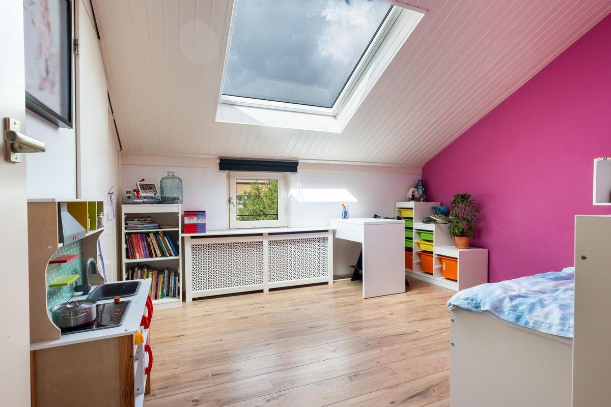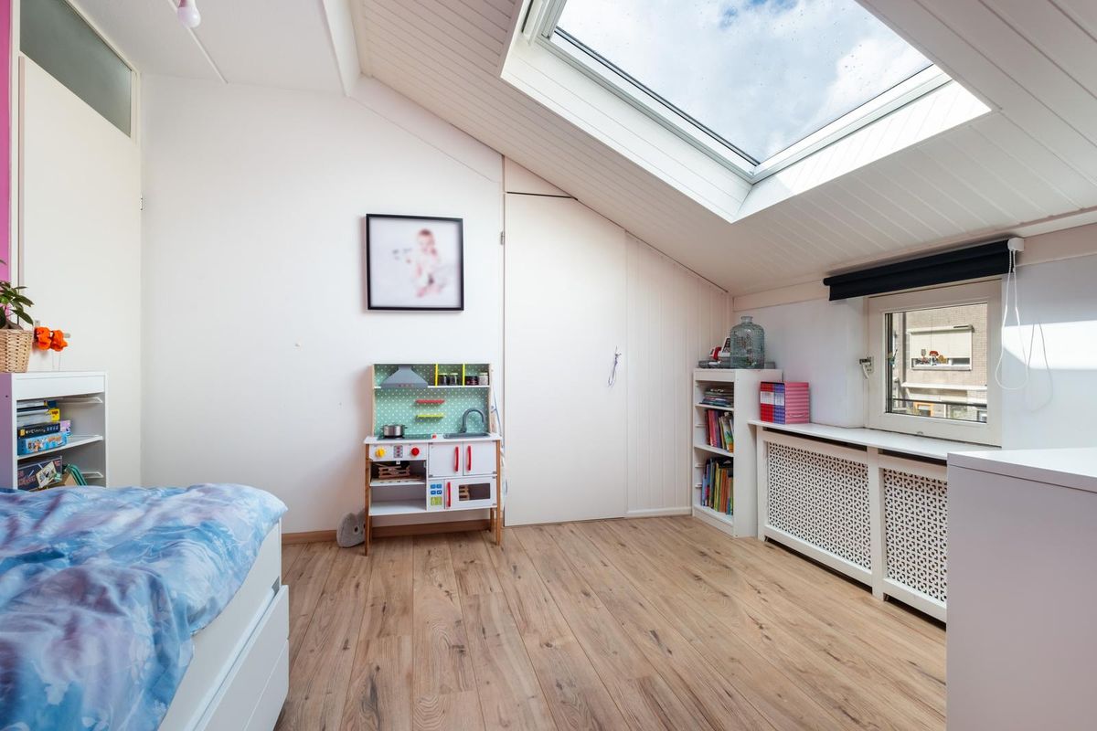 De zolderverdieping is verrassend ruim en veelzijdig in gebruik. Op de overloop is extra bergruimte aanwezig en in de kamer zelf kun je achter de knieschotten veel spullen kwijt. Dankzij de royale nokhoogte van maar liefst 320 cm en de grote raampartijen is dit een bijzonder lichte en prettige ruimte, die zich uitstekend leent als extra slaapkamer, werkkamer of hobbyruimte.