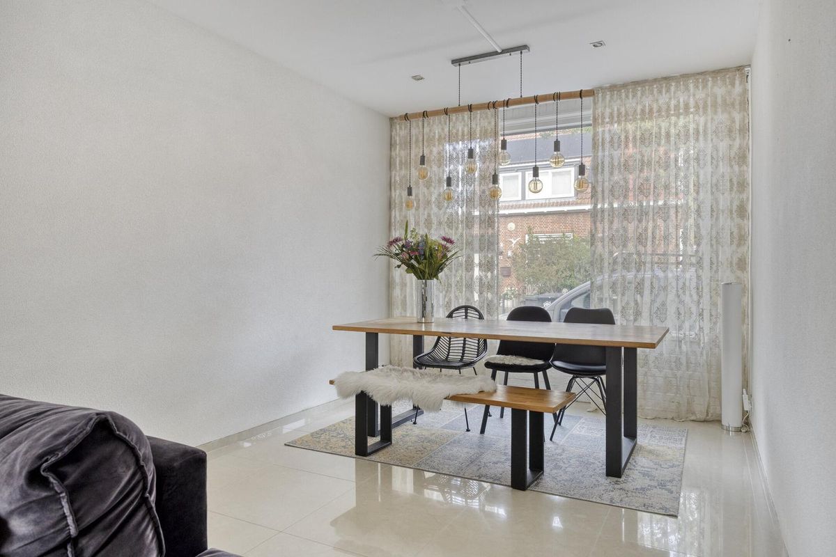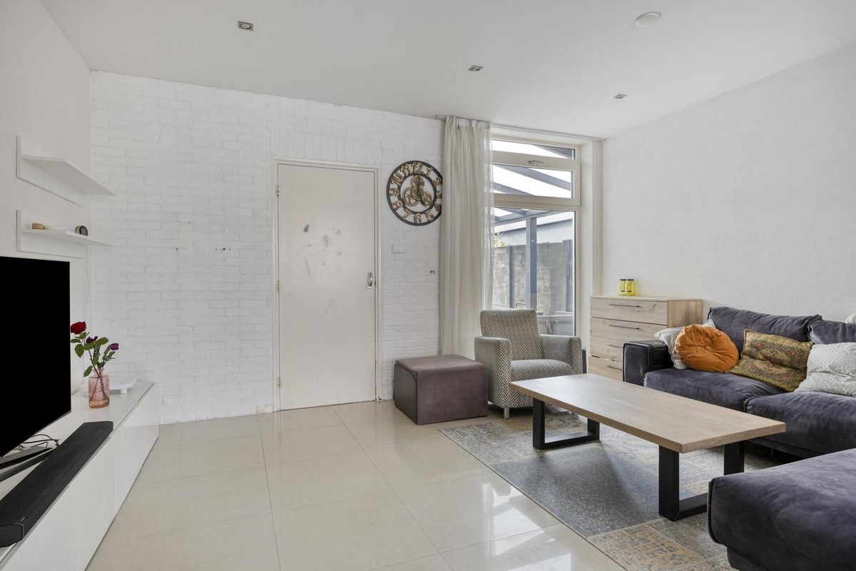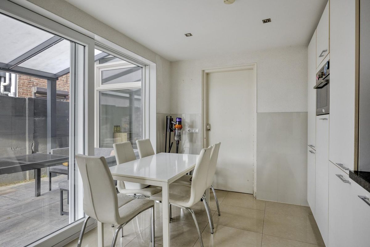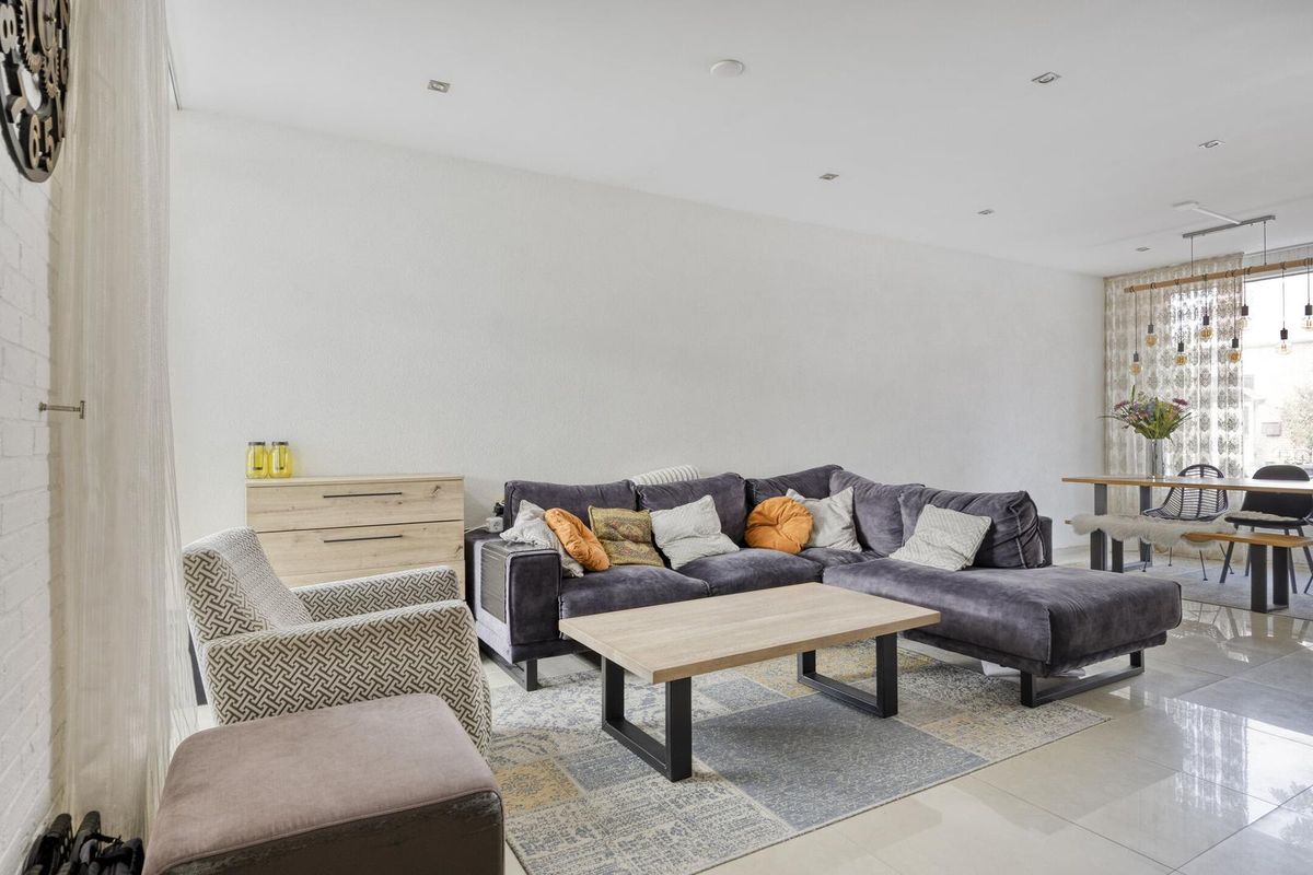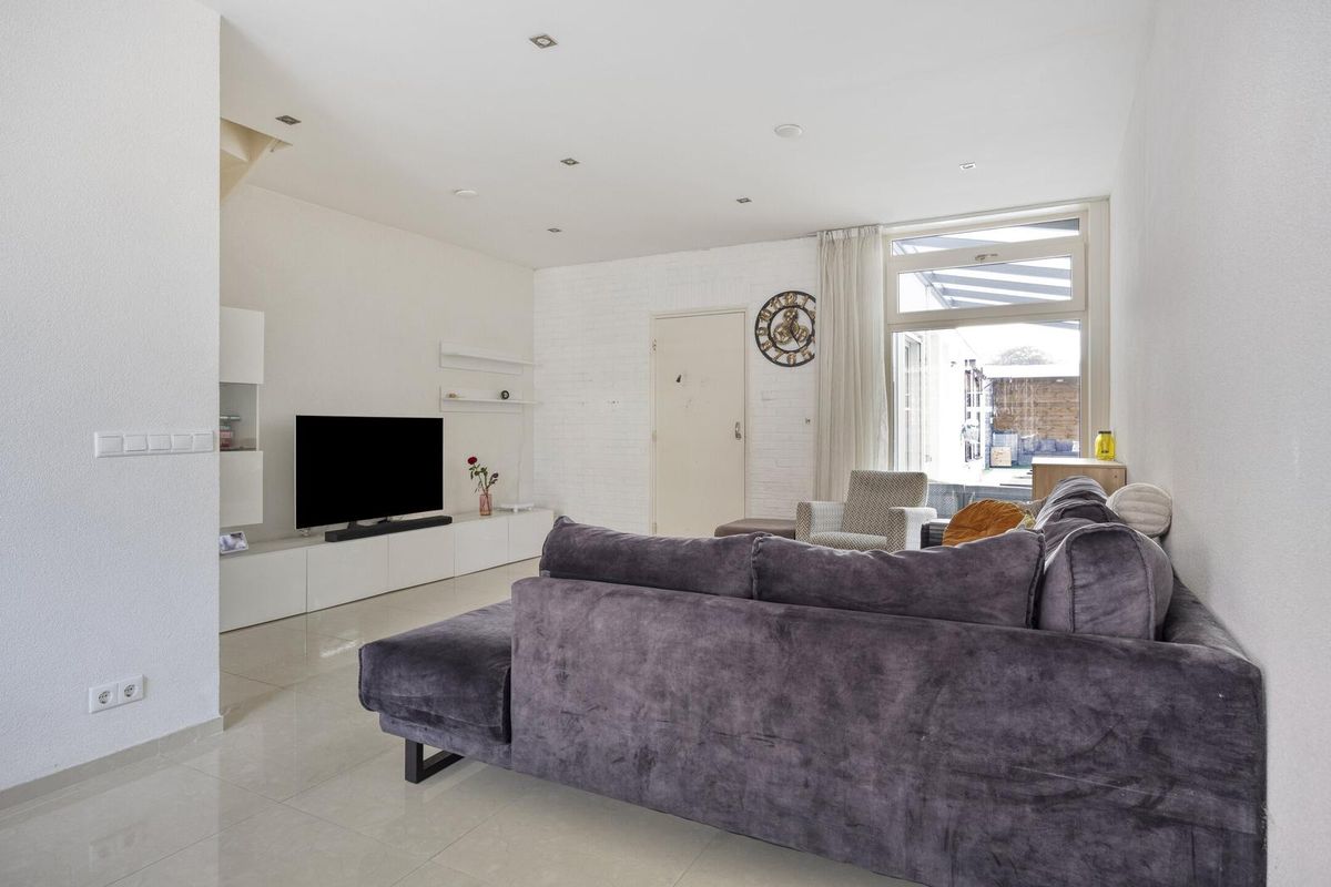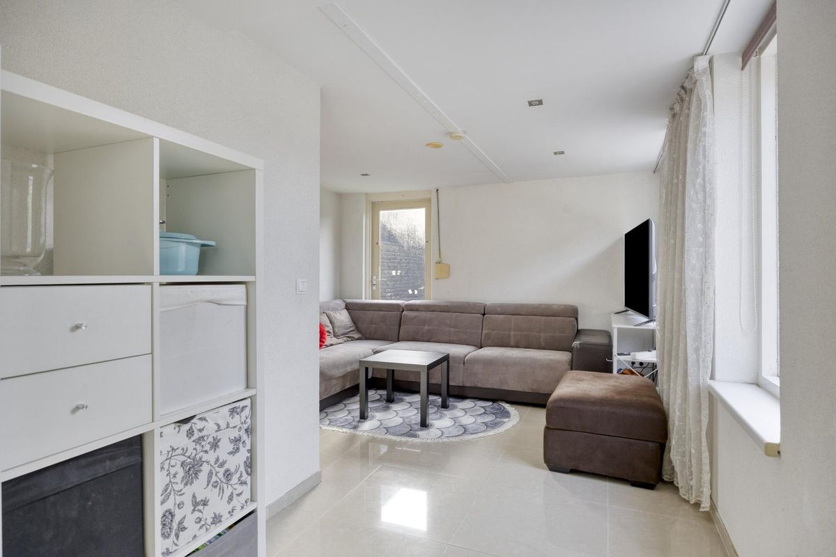 De woonkamer is ruim en sfeervol, met een prachtige tegelvloer en strak afgewerkte muren. Dankzij ramen aan zowel de voor- als achterzijde valt het daglicht rijkelijk naar binnen, wat zorgt voor een frisse en levendige uitstraling.