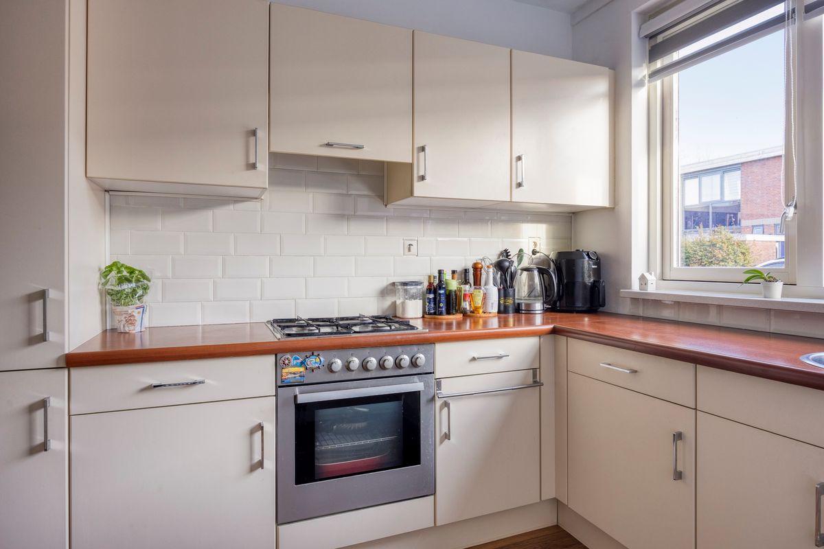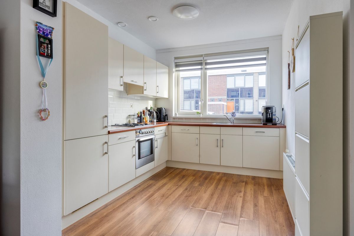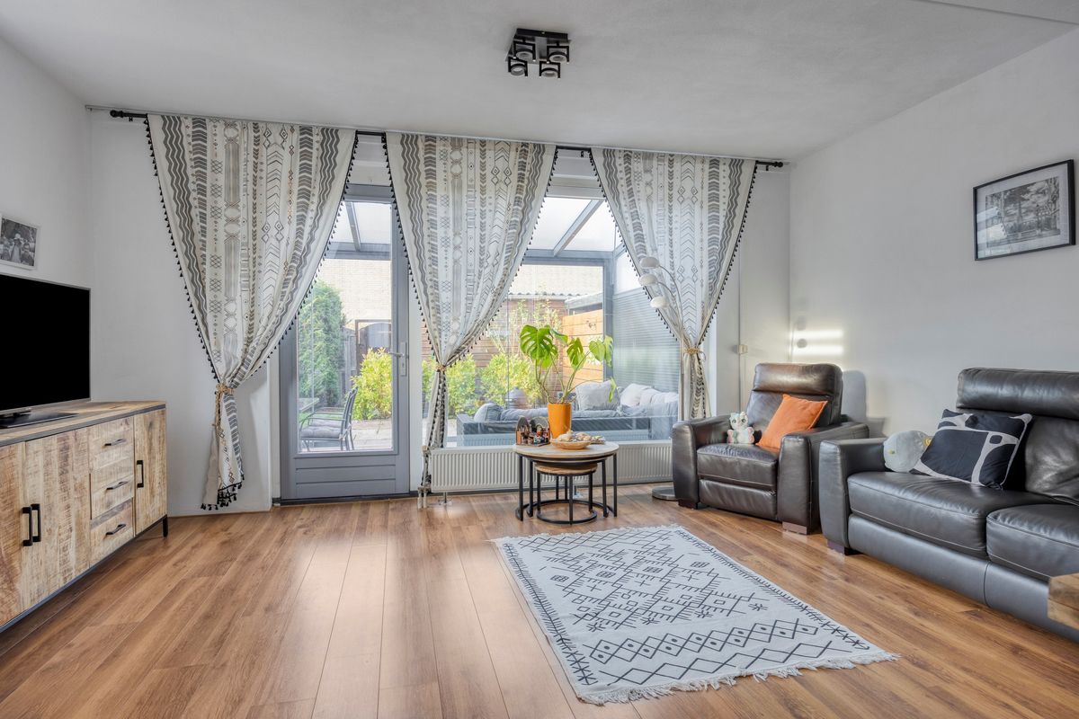 Eigen entree met hal, toegang tot het toilet en de meterkast. De L-vormige woonkamer heeft een open keuken met diverse inbouwapparatuur en is heerlijk licht dankzij de extra ramen aan de zijkant. Aan de woonkamer grenst een ruime serre die zorgt voor extra wooncomfort.