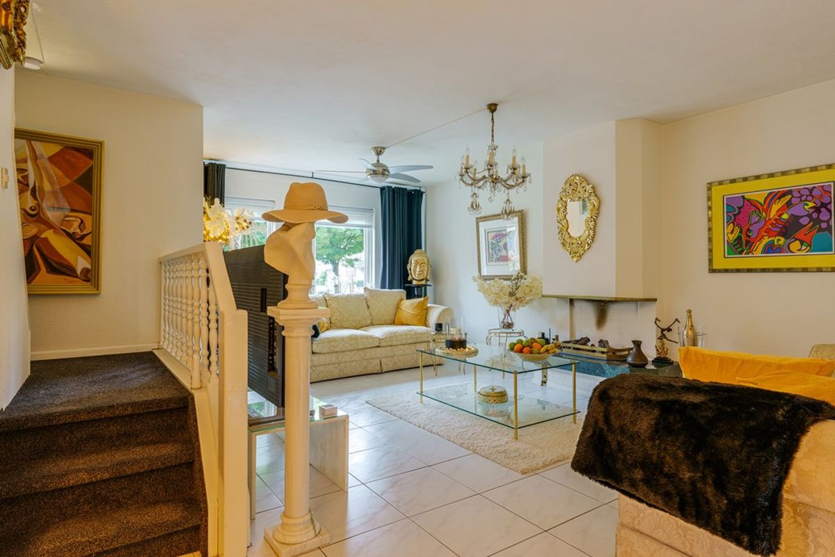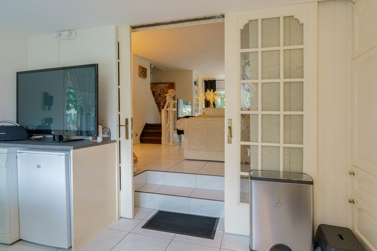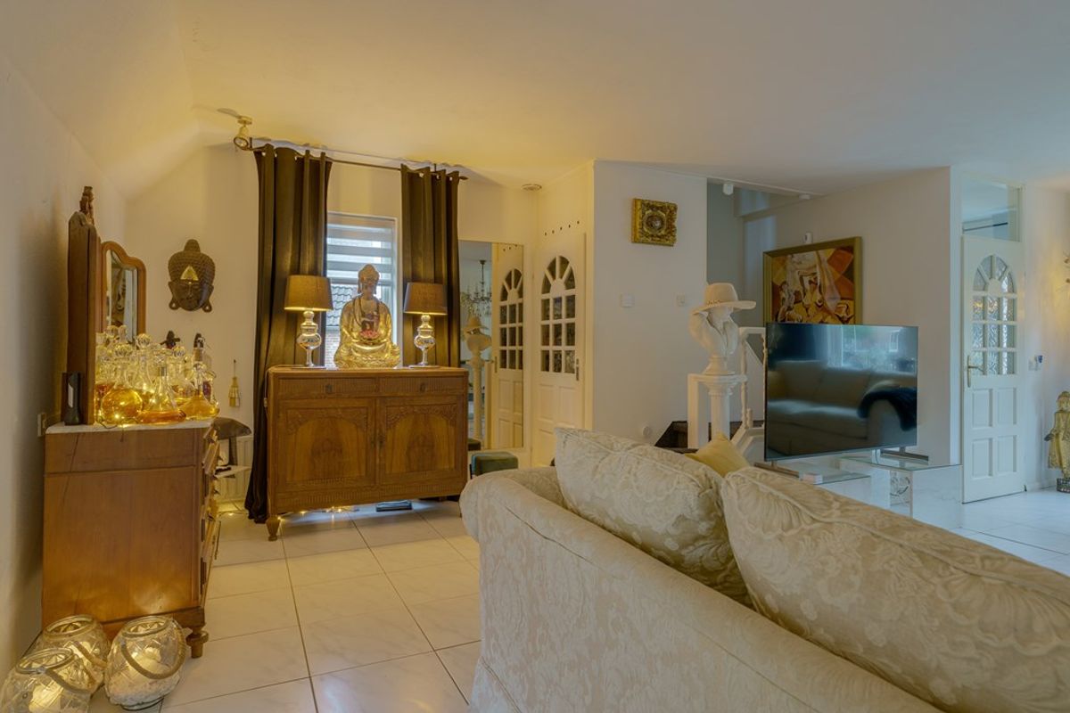 Through the neat front garden, you enter the house. Upon entering, the meter cupboard is immediately on the right and the toilet straight ahead. To the left, the entrance leads to the bright and spacious living room, which offers a pleasant flow and plenty of natural light through large windows at the front and back. The living room is attractively and practically arranged, with enough space for a comfortable sitting area and dining table. At the rear is the kitchen, accessible through a sliding door. The kitchen is functionally designed and offers plenty of cupboard and counter space. The staircase to the first floor is located on the right-hand side of the living room.