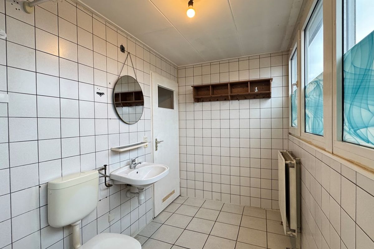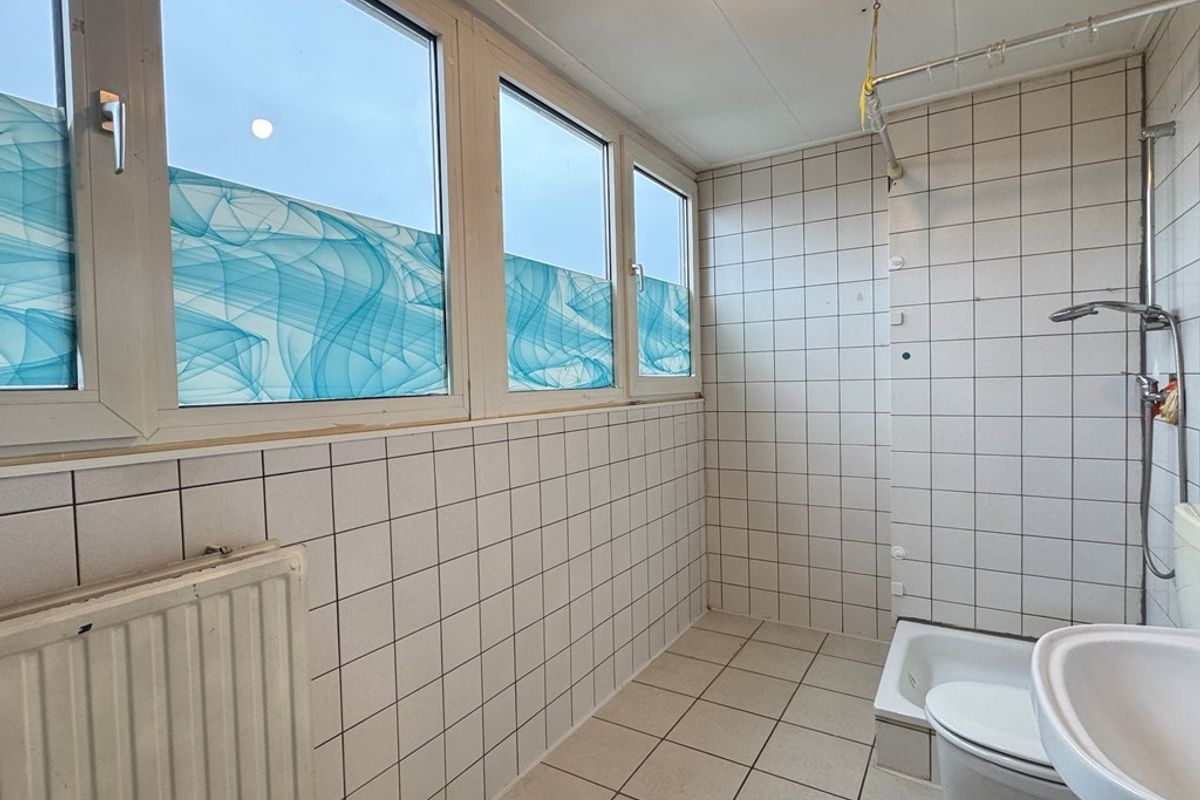 - Badkamer met douche, wastafel, toilet en dakkapel.