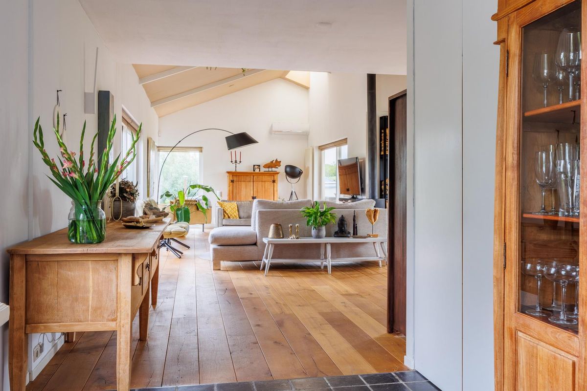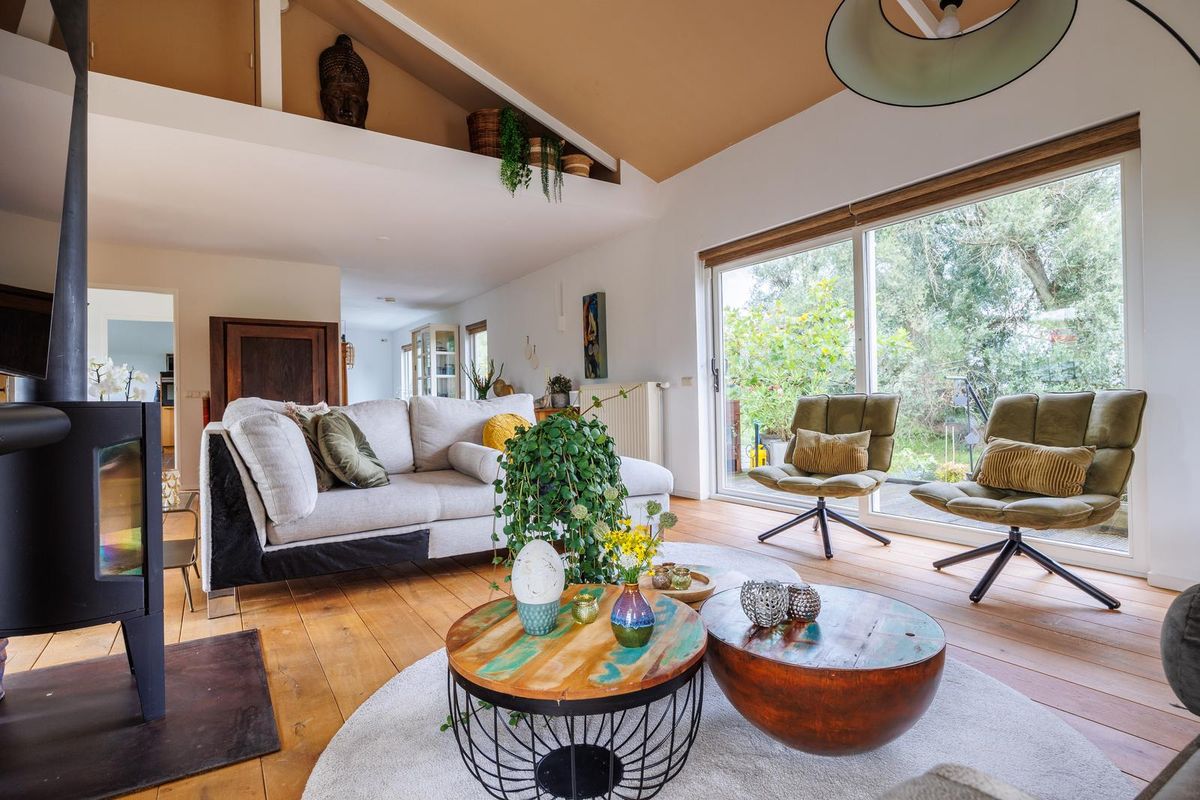 Riante living met eiken vloer, houtkachel, airco, schuifpuien en vide (met aparte bergruimte)