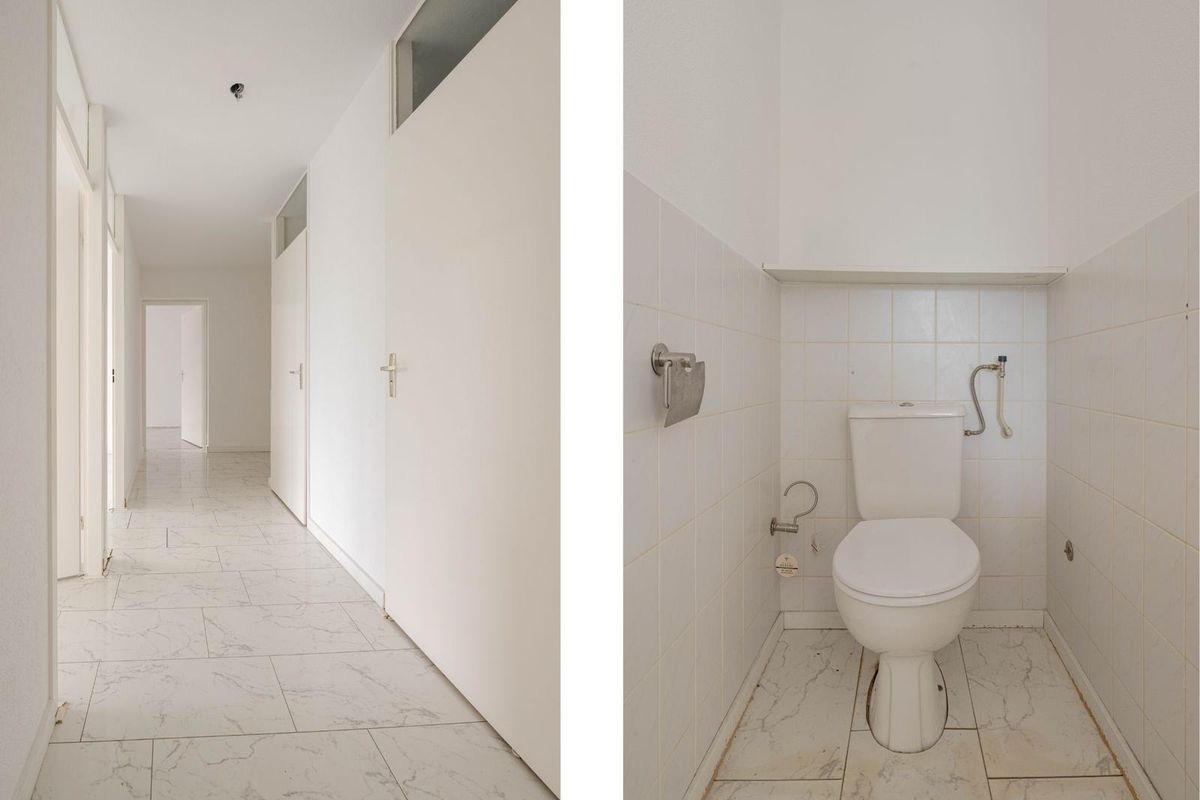 * Toiletruimte met duoblok-opstelling en half betegeld.