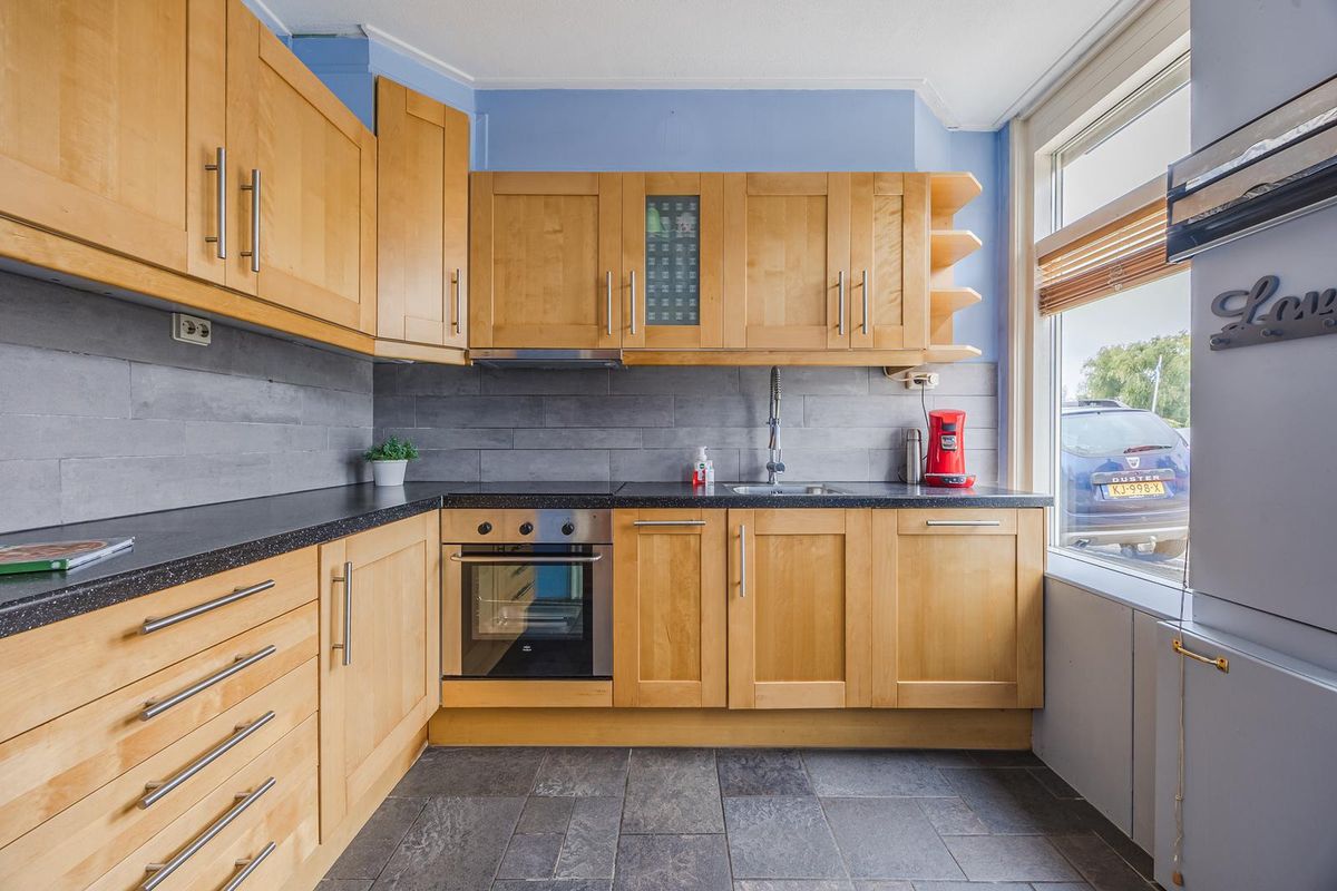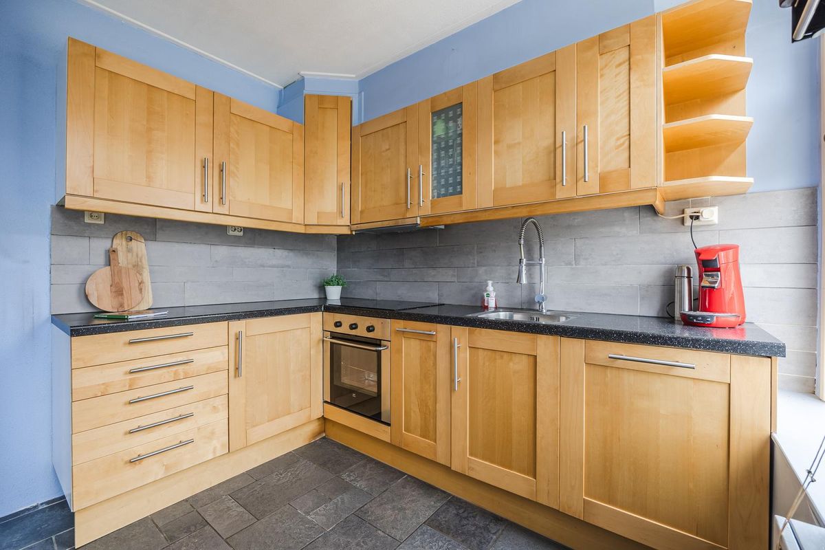 De halfopen keuken is voorzien van een tegelvloer en de keuken zelf is uitgevoerd in een houtdesign. De keuken beschikt over inbouwapparatuur: inductie kookplaat, afzuigkap, oven en een vaatwasser. Via de keuken heeft u via de originele voordeur toegang tot de voorzijde van de woning.