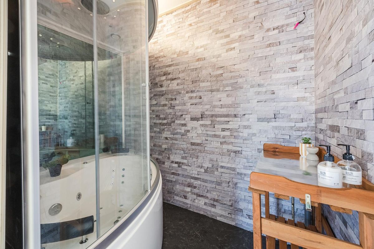 De badkamer is voorzien van een tegelvloer en een heerlijk groot hoekbad, wat feitelijk een compleet Wellness center is met sfeerverlichting. Het heeft tevens een stoom / douchefunctie. In de badkamer is een aansluiting voor een wastafel.