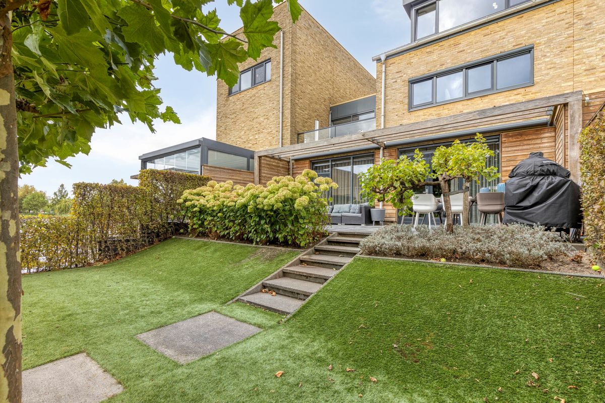 De diepe (13,50 m) en brede (9,50 m) achtertuin ligt op het westen en is stijlvol aangelegd. Geniet van het fraai betegelde terras met handige tuinkast en een trapje naar de lagergelegen tuin met kunstgras, extra terras en een vlondersteiger – perfect voor het aanleggen van een bootje. De tuin is voorzien van water- en elektra-aansluitingen en omringd door vaste planten en imposante platanen, die door het automatische beregeningssysteem ook in de droge periodes water krijgen en weinig onderhoud vergen. Gelegen aan de rustige Volgerplas biedt deze tuin een prachtig vrij uitzicht en een oase van rust. In de zomer lekker varen met een bootje en in de winter verandert deze plek in een waar schaatsparadijs: vanuit uw eigen tuin kunt u zo het ijs op glijden voor urenlang winterplezier.