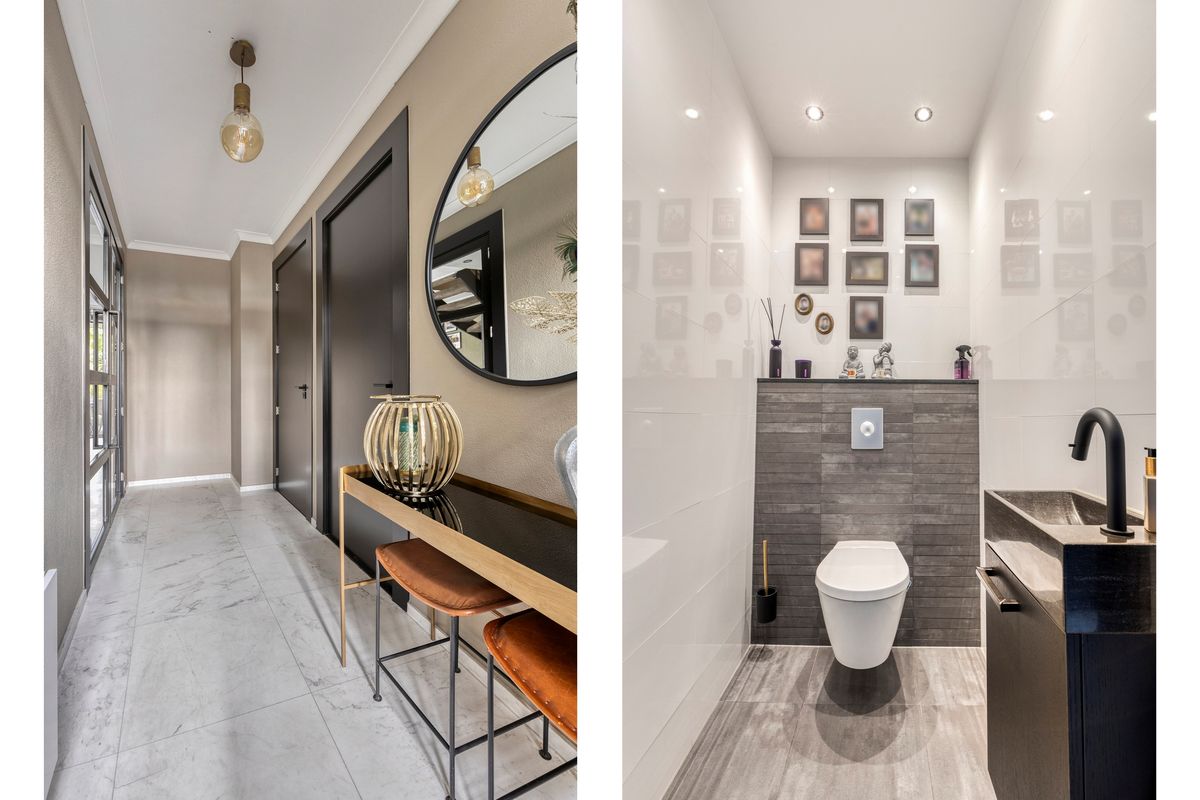 De toiletruimte is volledig betegeld en afgewerkt met een stijlvol zwevend toilet en een compact wastafelmeubel. Het plafond is voorzien van inbouwspots, die door een bewegingssensor aangaan en mechanische ventilatie zorgt voor een prettig klimaat. Een nette, luxe ruimte die perfect aansluit bij de rest van de woning.