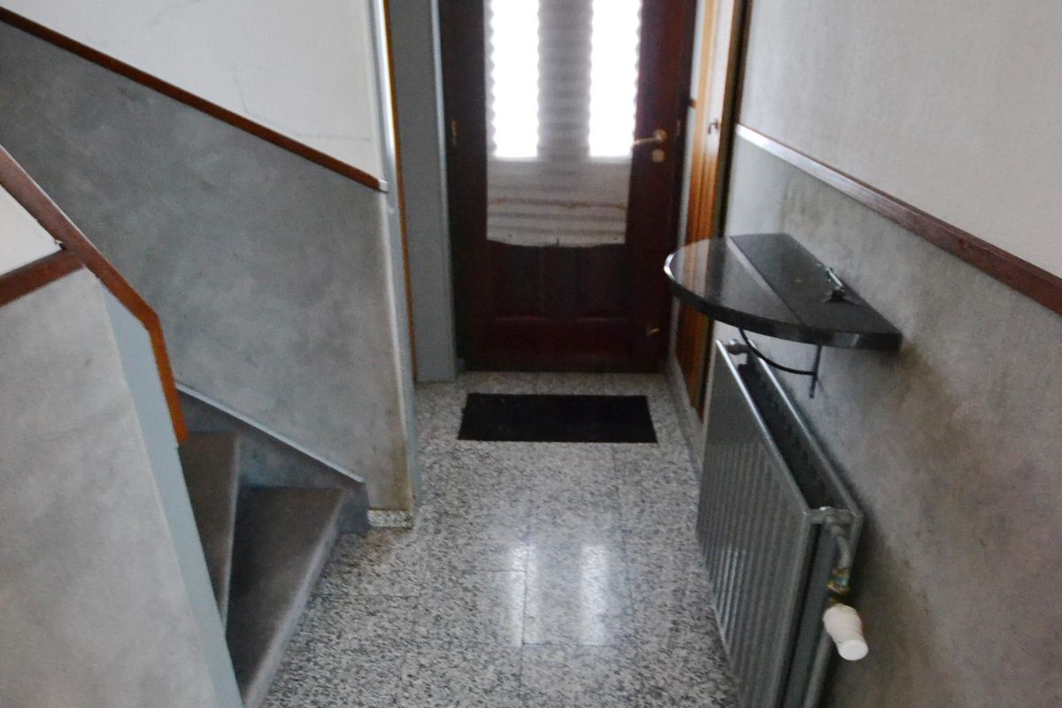 Entree/gang 3,60 x 1,20 met granieten vloer, nieuwe meterkast met slimme meters, garderobekast, deur naar woonkamer en kelder en trap naar verdieping.