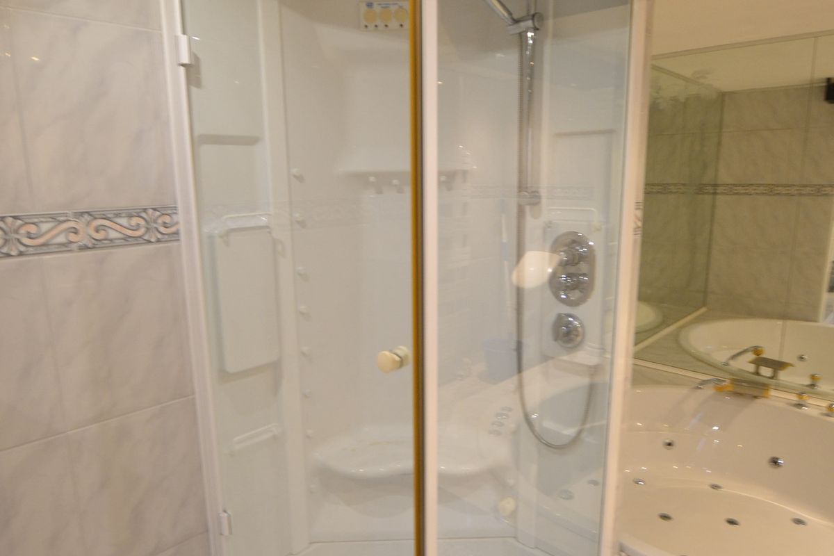 Badkamer 5,45 x 2,70 met granieten vloer met vloerverwarming, inbouwspots, jacuzzi met whirlpool en powerjets, stoom/massage douchecabine, hangtoilet, urinoir, design badkamermeubel met twee wastafels en twee design radiators.