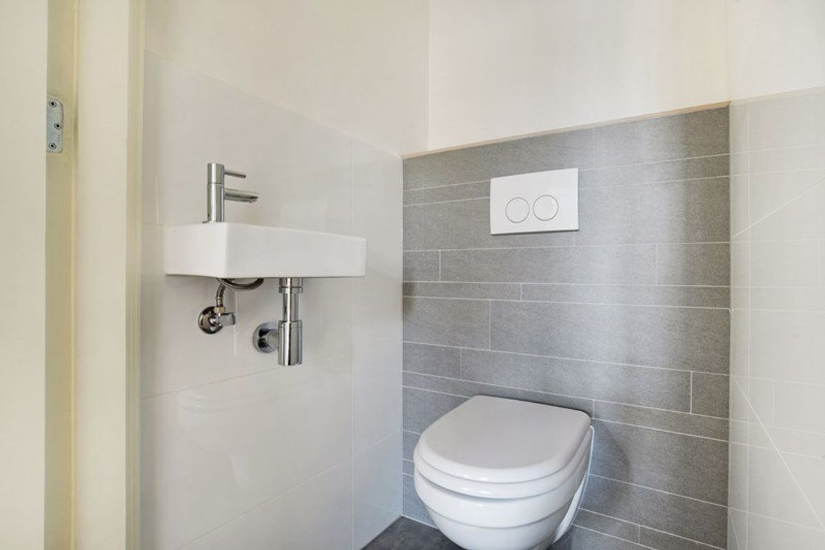 Entree van het appartement naar de hal, hier bevindt zich een separaat toilet met fonteintje. Tevens is er een vaste kast met wasmachine aansluiting en CV combiketel.