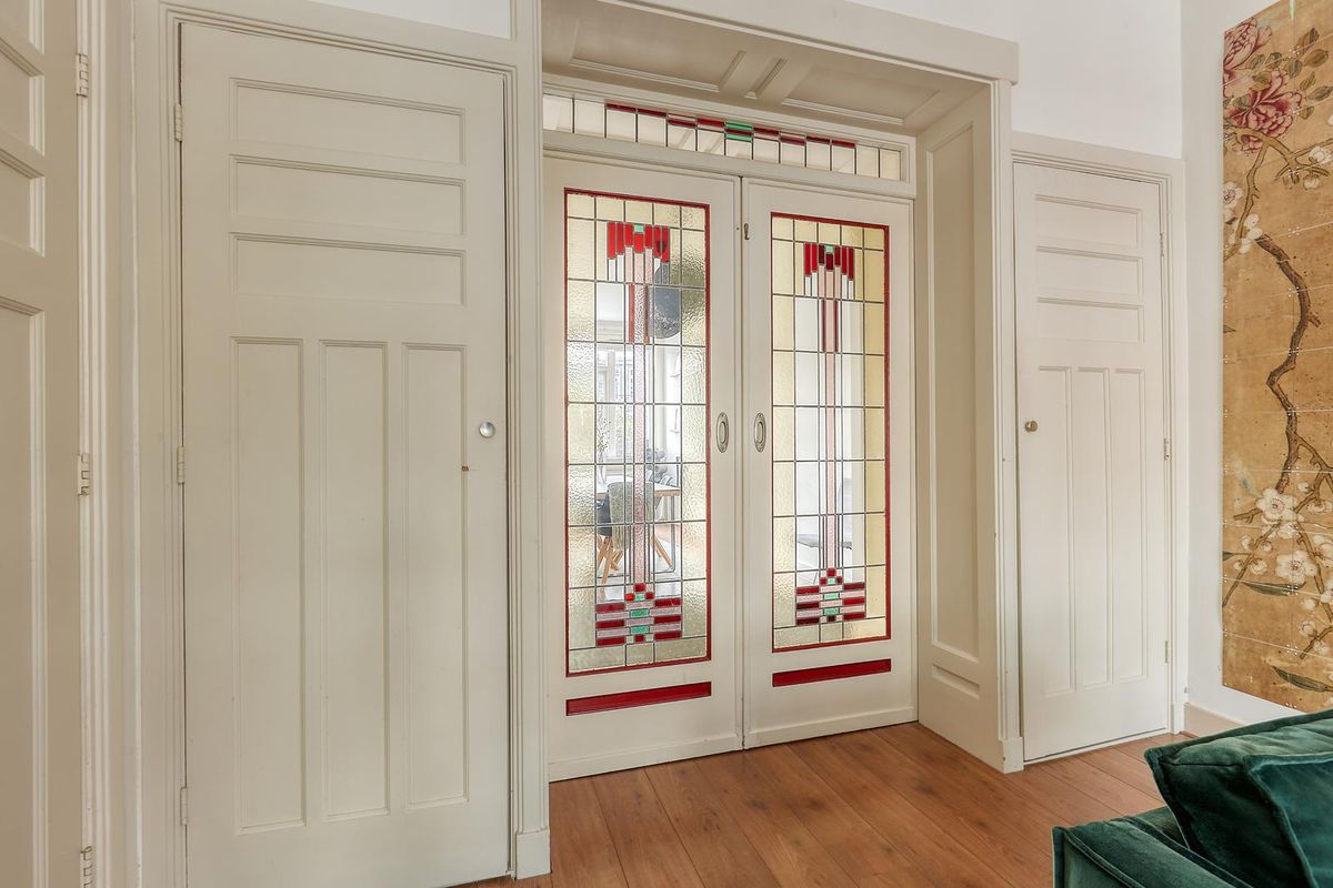 Open portiek naar de 1ste etage. Entree, hal met toegang tot alle vertrekken. Toilet met fonteintje en vaste kast. Ruime, sfeervolle woonkamer met karakteristieke glas-in-lood en-suite deuren, waarmee de voor- en achterkamer stijlvol van elkaar gescheiden kunnen worden. Dichte, nette keuken voorzien van alle inbouwapparatuur: koelkast, vriezer, oven, vaatwasser, gasfornuis en afzuigkap, met toegang tot het balkon. Ruime slaapkamer aan de voorzijde en een tweede ruime slaapkamer aan de achterzijde, welke via openslaande deuren toegang biedt tot het balkon, gelegen op het westen, waardoor je kunt genieten van de heerlijke avondzon. Nette badkamer voorzien van bad/douche, vaste wastafel met meubel, handdoekradiator en ruimte voor de wasmachine.