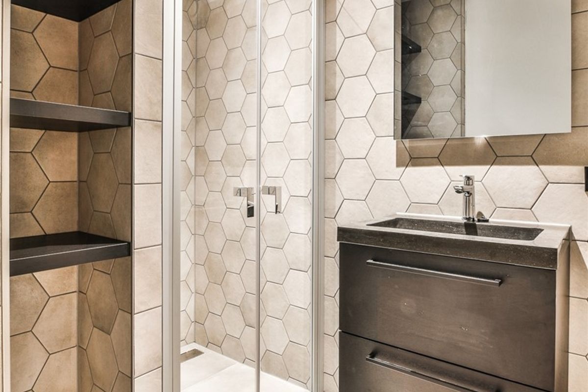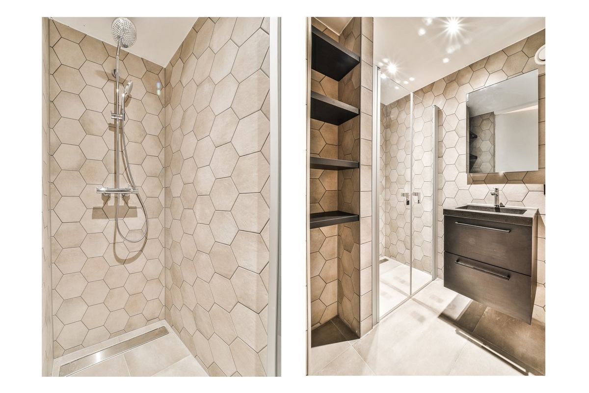 - de badkamer met hoogwaardige afwerking, wastafel, inbouwkast en inloopdouche