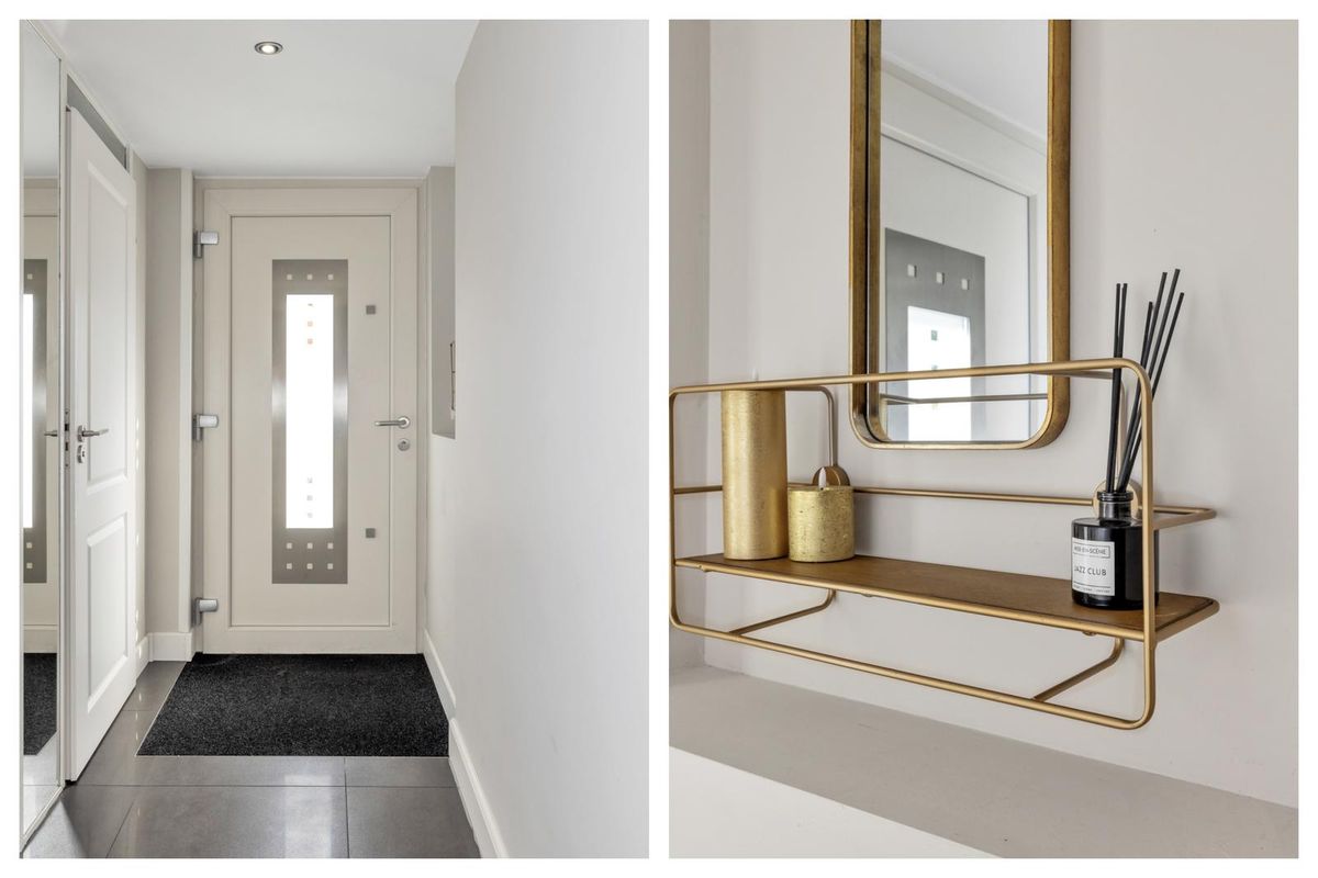 Je betreedt de woning via een onderhoudsarme voortuin en een moderne kunststof voordeur. De ruime hal is voorzien van een plavuizenvloer en biedt toegang tot de meterkast (met 3-fasen aansluiting voor laadpaal) en een strak afgewerkte toiletruimte met vrijhangend wandcloset en fonteintje.