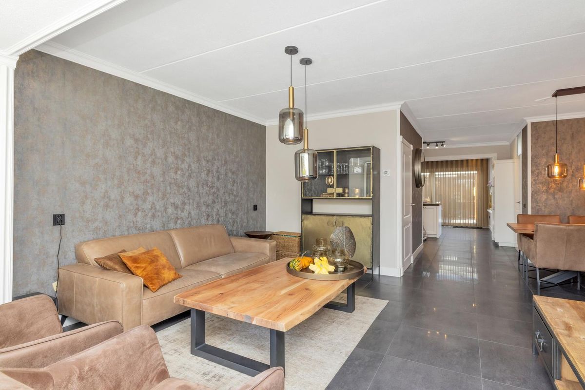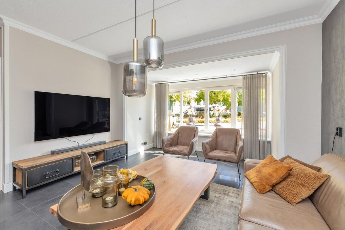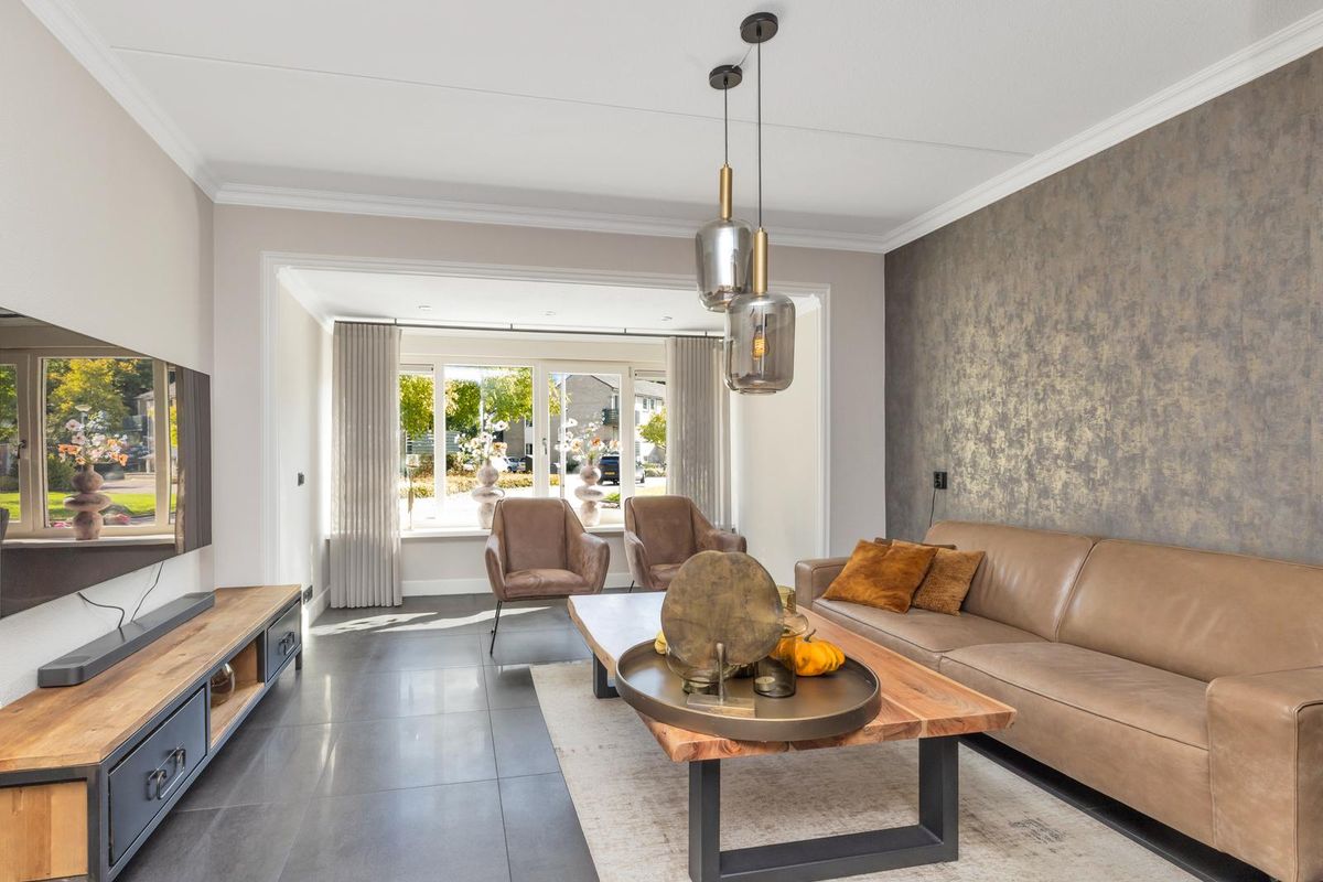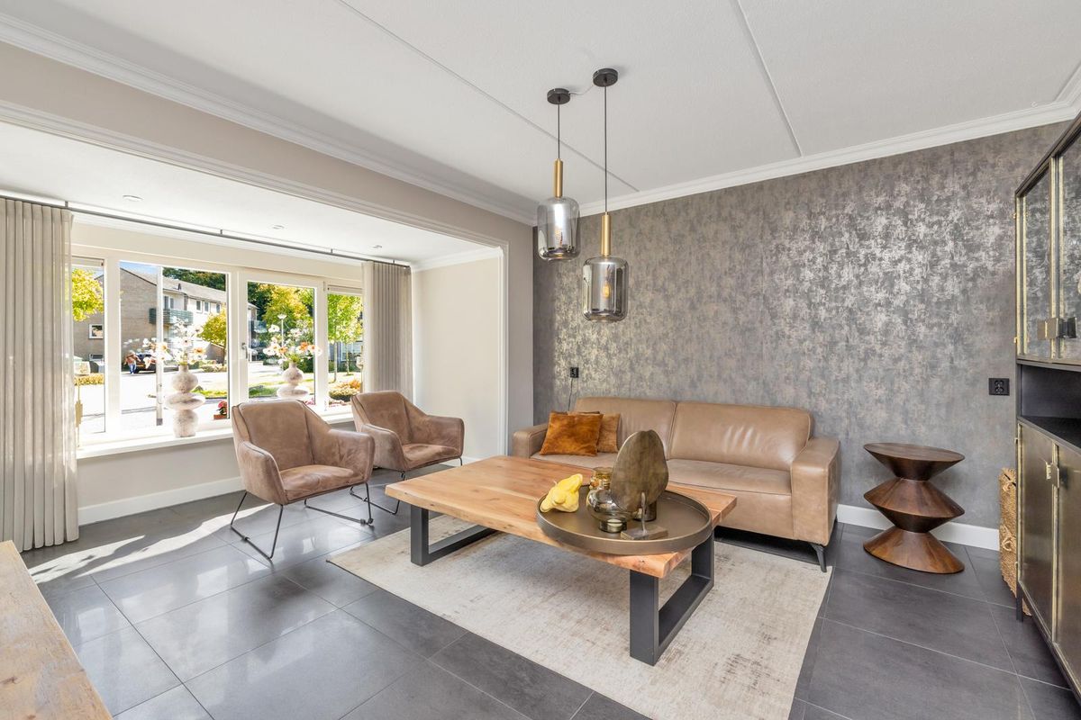 De royale Z-vormige woonkamer met sfeervolle erker is een fijne, lichte leefruimte. De vloer is afgewerkt met plavuizen en beschikt over vloerverwarming, wat zorgt voor extra comfort. De woonkamer biedt toegang tot een vaste trap naar de eerste verdieping én een praktische trapkast met veel opbergruimte.