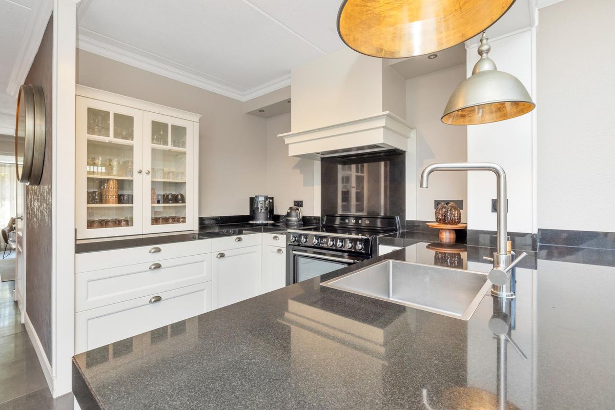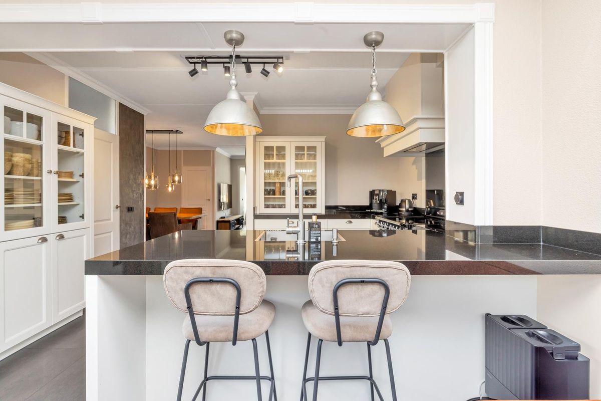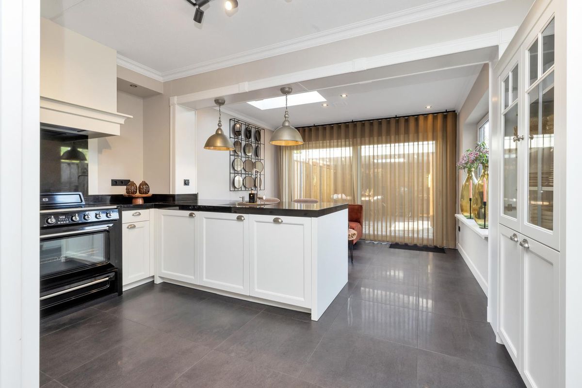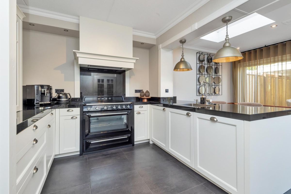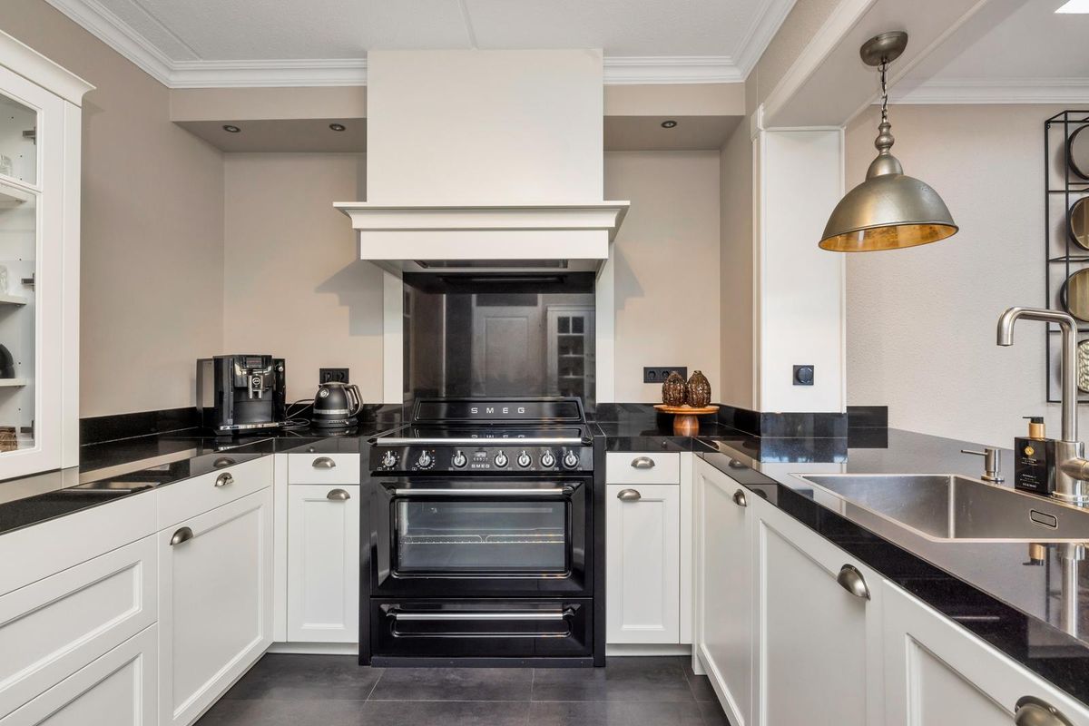 Aansluitend bevindt zich de moderne woonkeuken, gelegen in de aanbouw. De keuken is uitgevoerd in een praktische U-opstelling en voorzien van luxe apparatuur zoals een Smeg oven met inductiekookplaat, een afzuigschouw, een vaatwasser en veel werk- en kastruimte. Het gezellige zitgedeelte met schuifpui biedt uitzicht op en directe toegang tot de achtertuin, wat deze keuken tot het kloppend hart van de woning maakt.