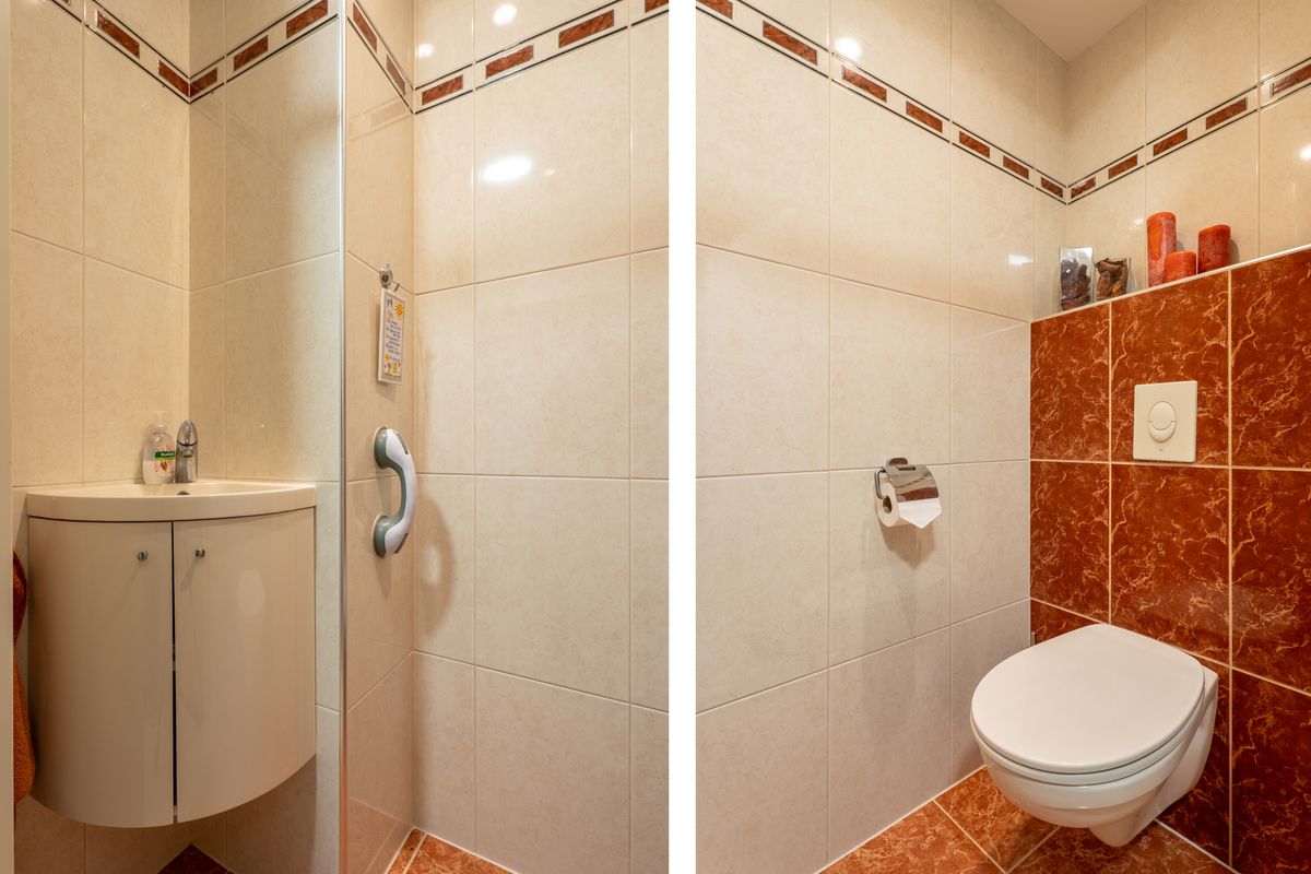 Op de eerste etage vind je twee ruime slaapkamers, waarvan één met rolluiken en de ander met dakramen. De badkamer beschikt over een raam, mechanische ventilatie, douche, toilet en wastafel.