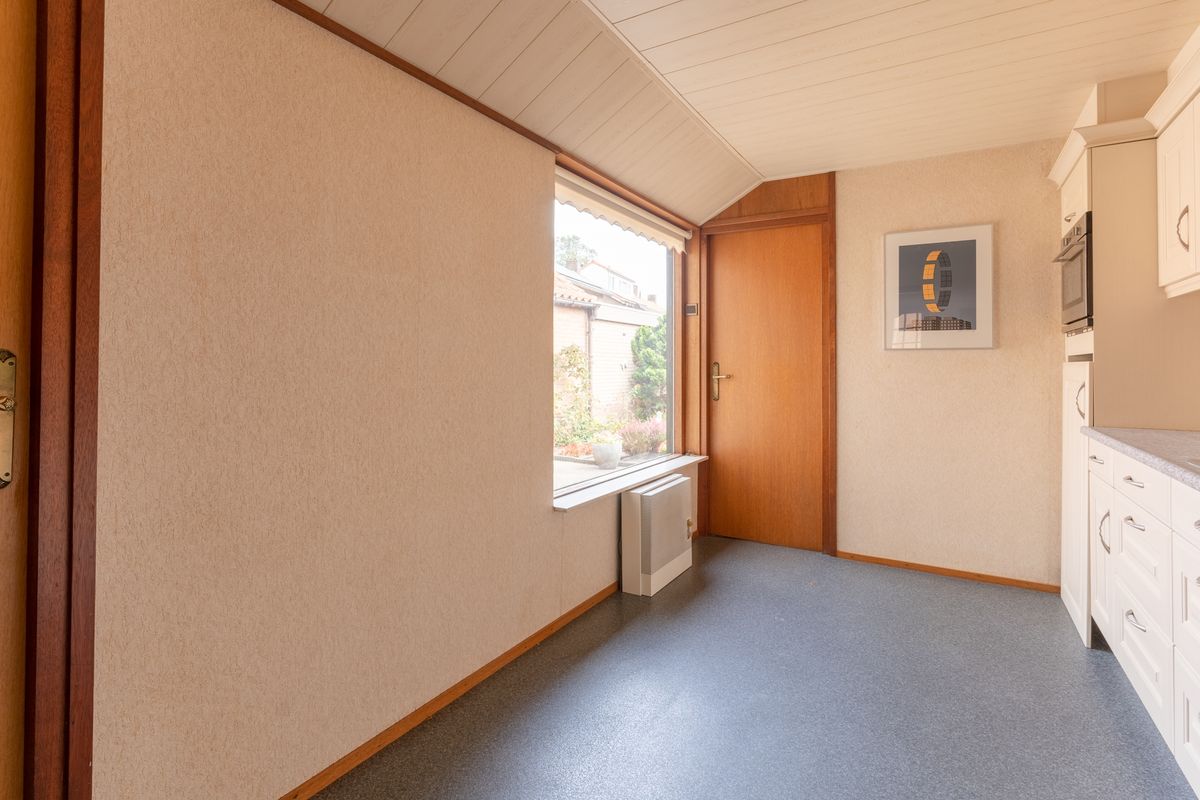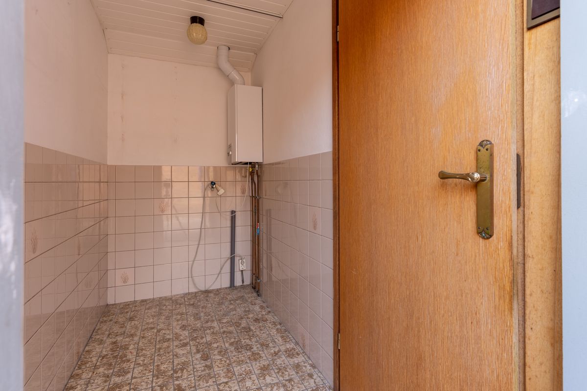 hal met toilet en kelderkast, uitgebouwde keuken met toegang tot de woonkamer. De voorzijde van de woonkamer is voorzien van een erker en de achterzijde van een schuifpui. Achter de keuken is nog een achterportaal met ruimte voor de wasapparatuur en de geiser, tevens vanuit hier toegang tot de tuin.