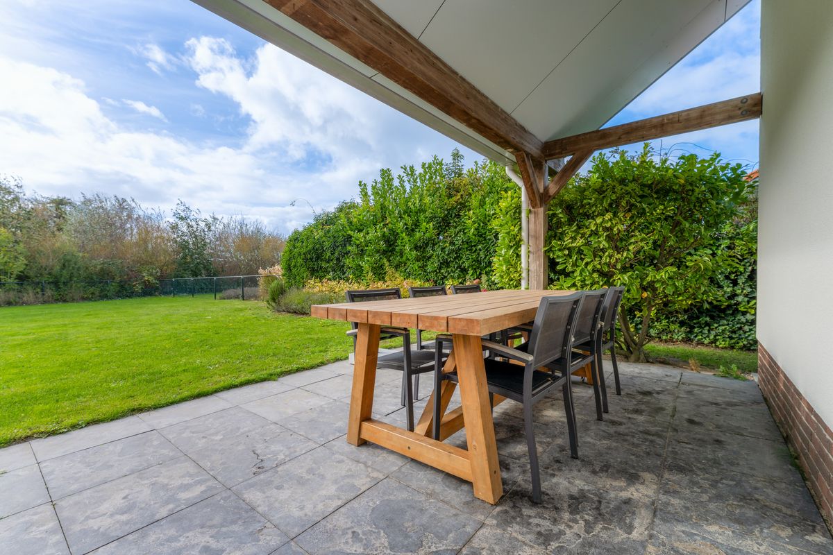 Onder de ruime overkapping is het heerlijk toeven, ongeacht het seizoen. Hier geniet je van de ochtendzon met een kop koffie of dineer je beschut op zwoele zomeravonden. De tuin biedt bovendien volop ruimte voor een loungeset, kinderspeelplaats of moestuintje.