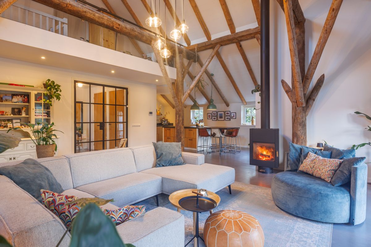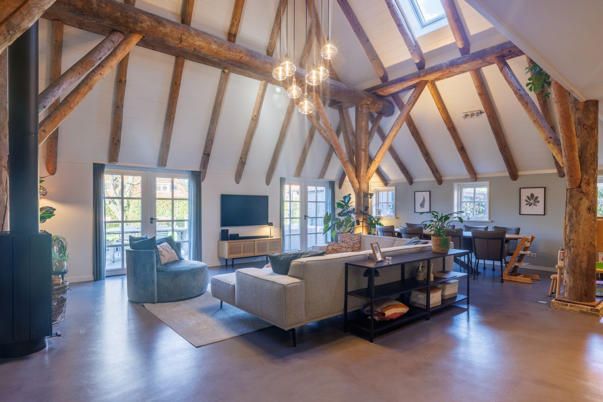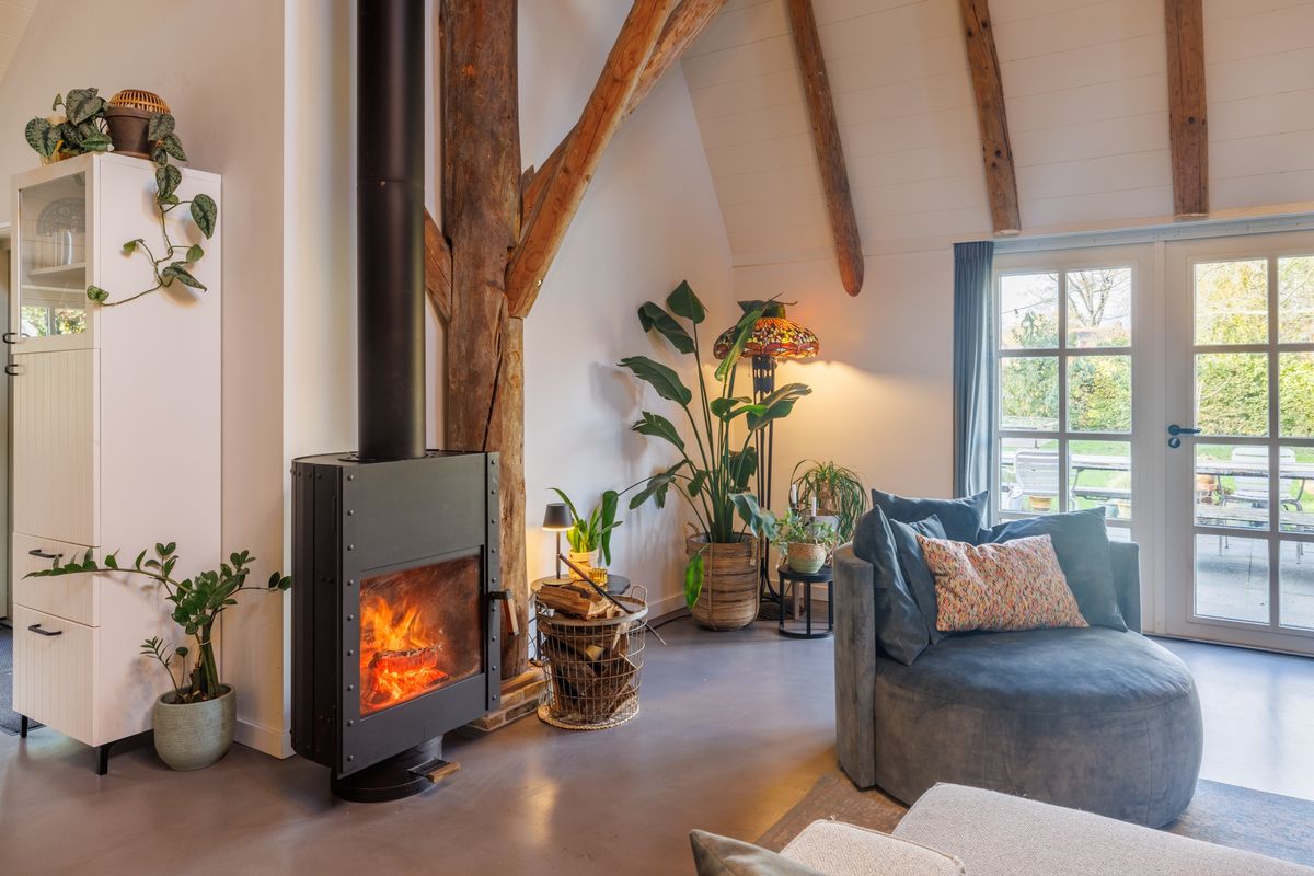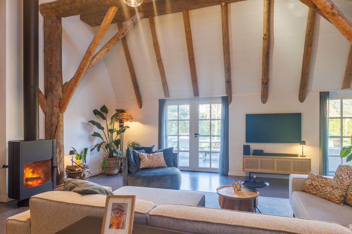 - Lichte open woonkamer met hoog plafond, een houtkachel en dubbele openslaande deuren naar het terras en de achtertuin.