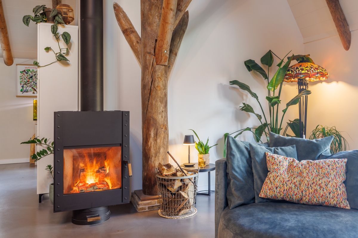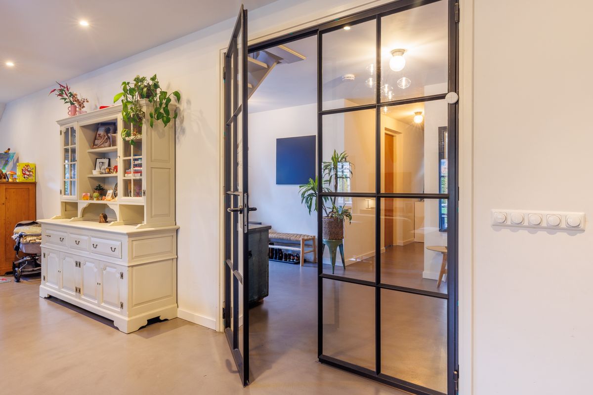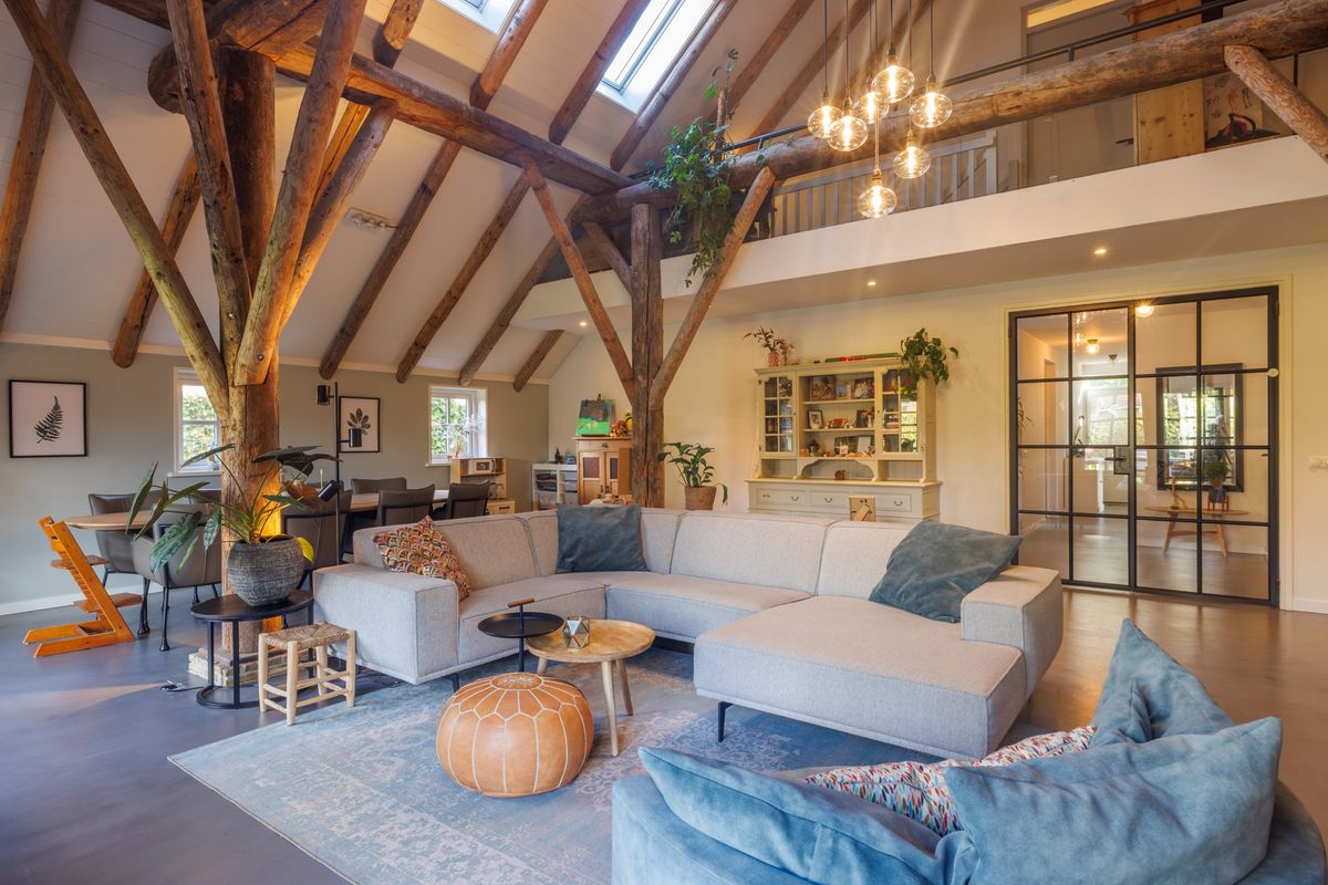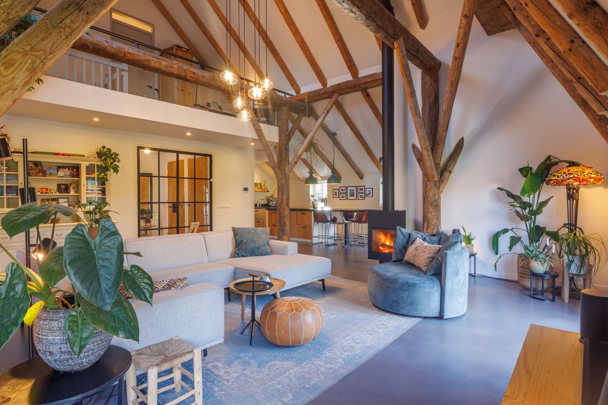 - Lichte open woonkamer met hoog plafond, een houtkachel en dubbele openslaande deuren naar het terras en de achtertuin.