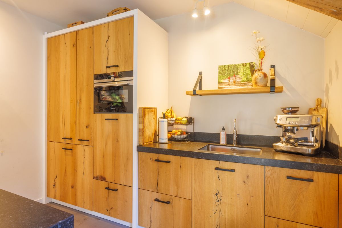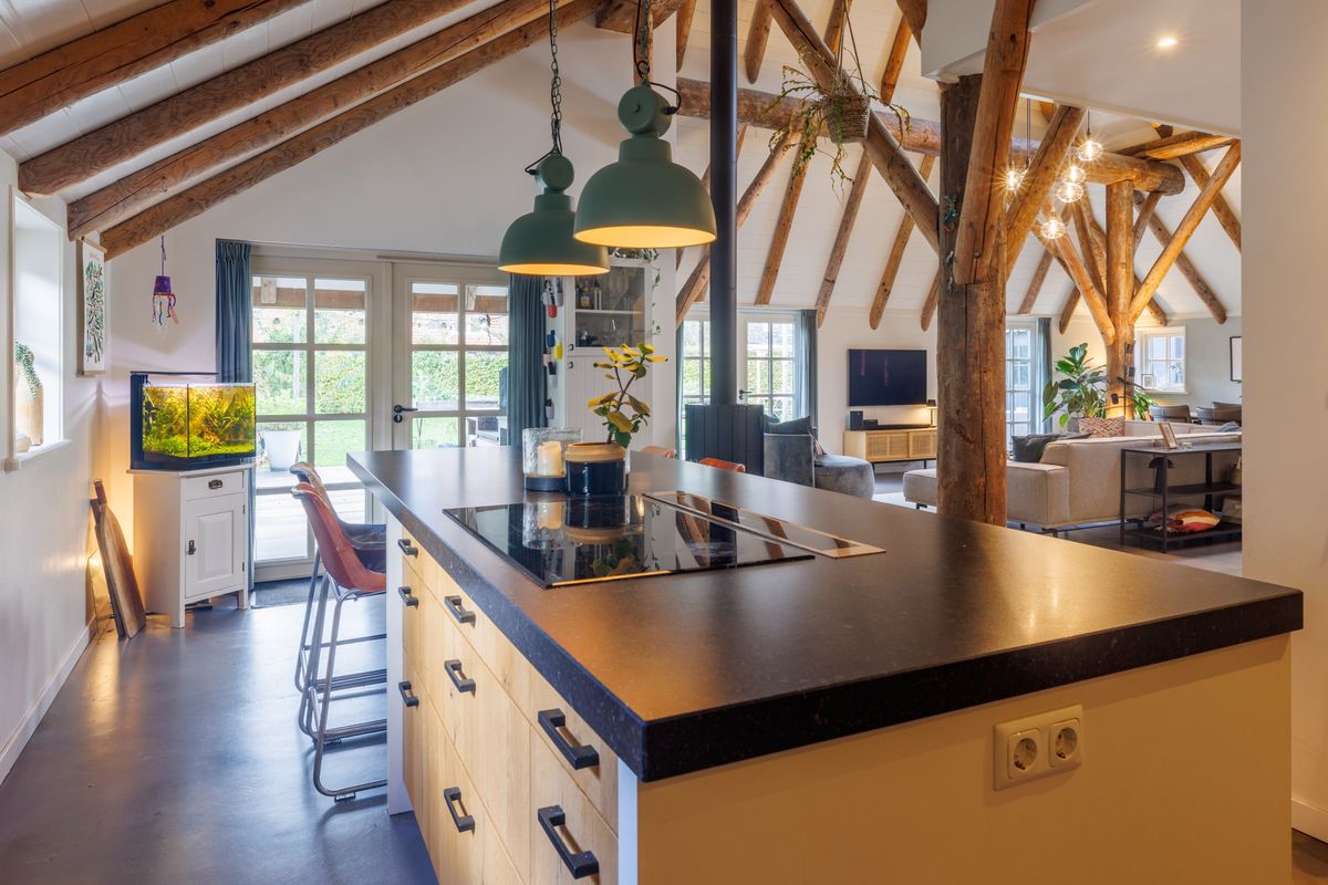 - Open keuken met kookeiland. Het kookeiland heeft een inductiekookplaat met geïntegreerde afzuiging. Verder voorzien van een vaatwasser, koelkast combimagnetron en Quooker. Ook vanuit de keuken zijn er openslaande deuren naar het half overdekte terras.
