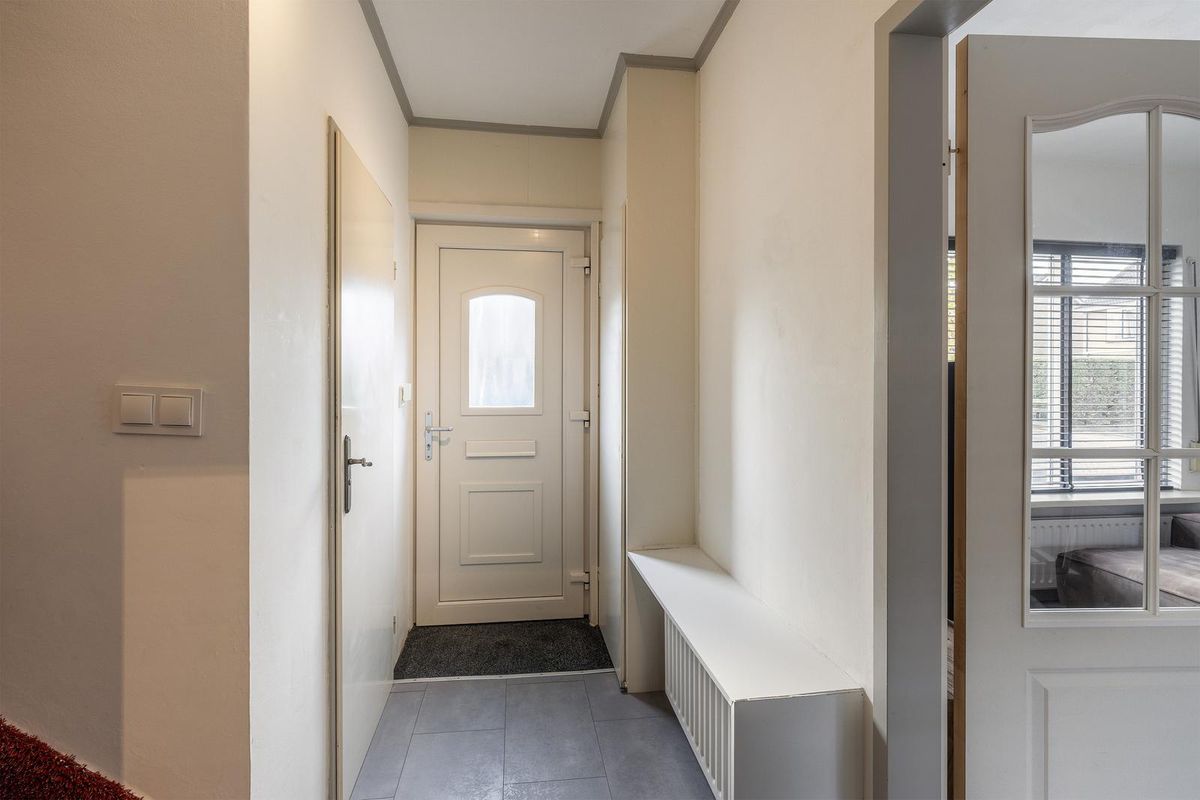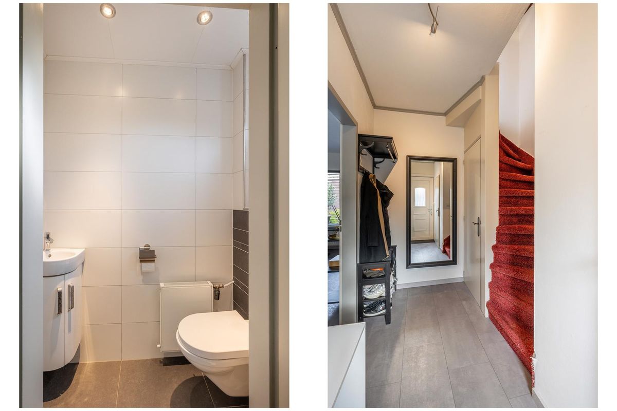 Hal/entree met kunststof voordeur, meterkast vernieuwd in 2021 (13 groepen, 3 aardlekschakelaars, kookgroep en slimme meter), geheel betegeld toilet met hangend toilet, fontein en radiator. Verder vind je hier de trapopgang naar de 1e verdieping, de kelderkast en toegang tot de woonkamer.