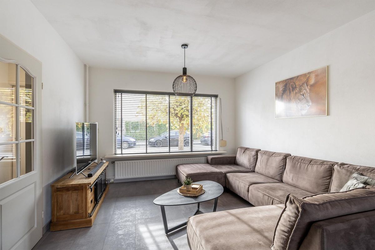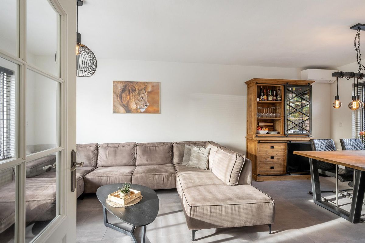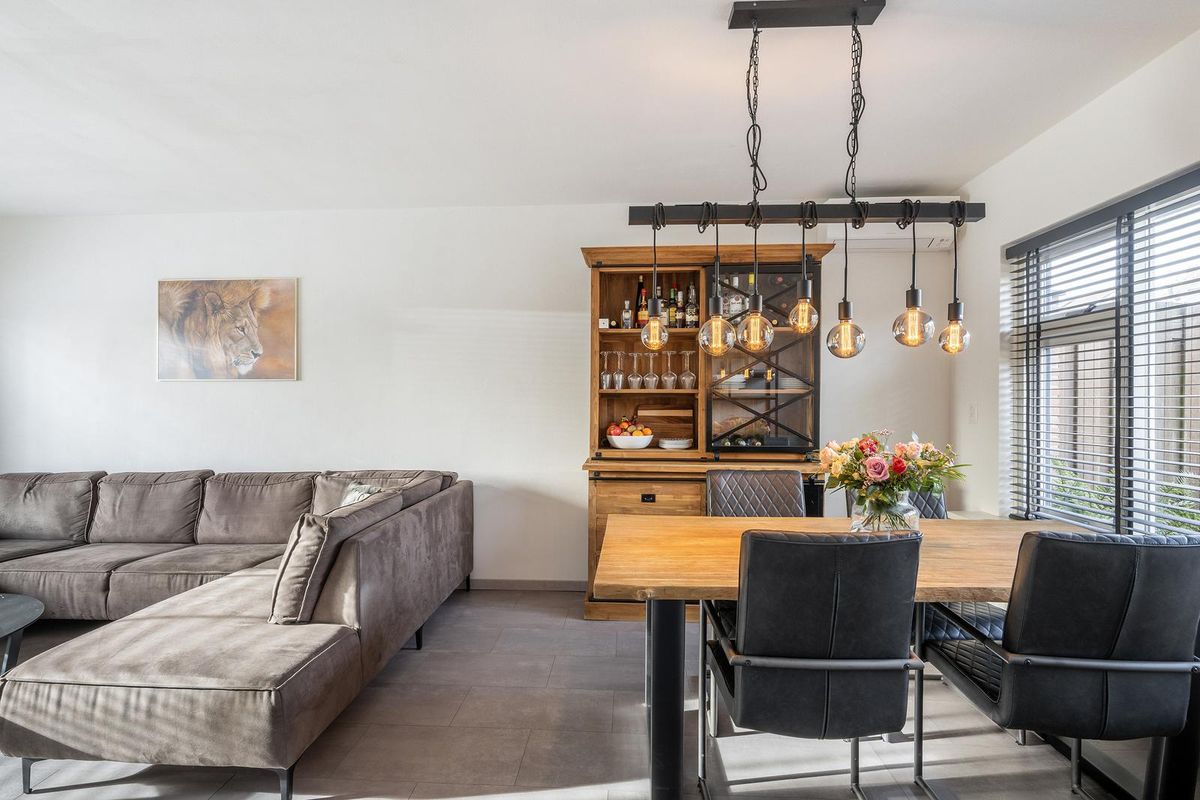 Royale 'doorzon' woonkamer met airco en rolluik. Aan de achterzijde van de woonkamer bevindt zich de halfopen keuken.