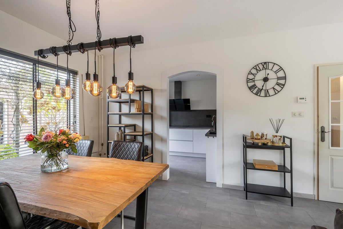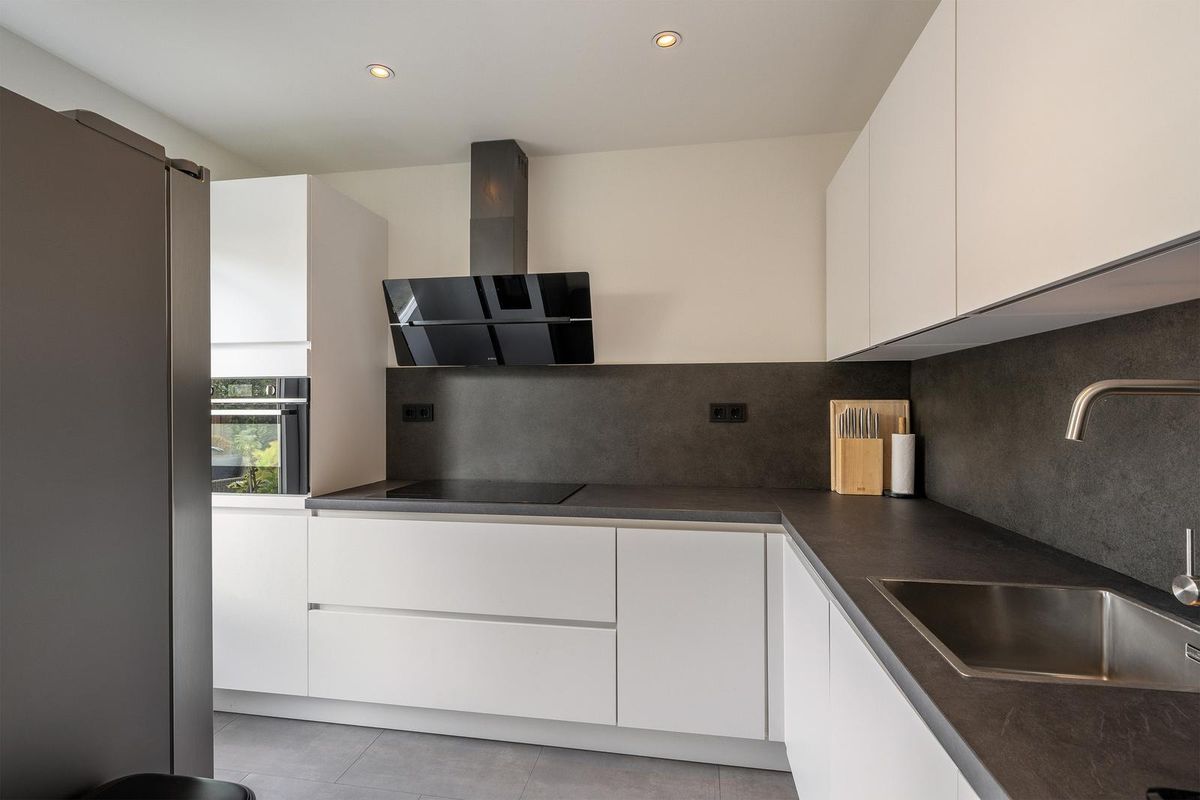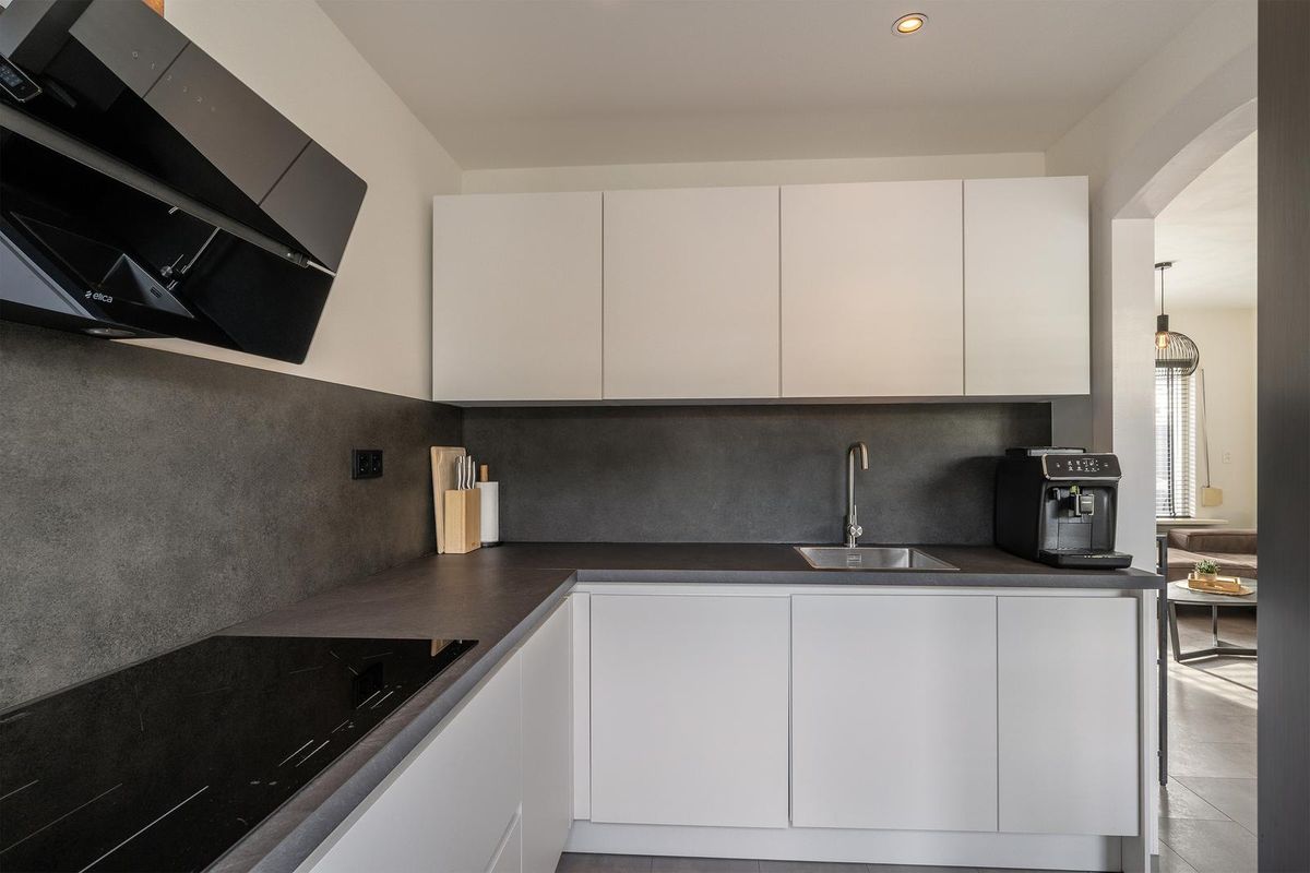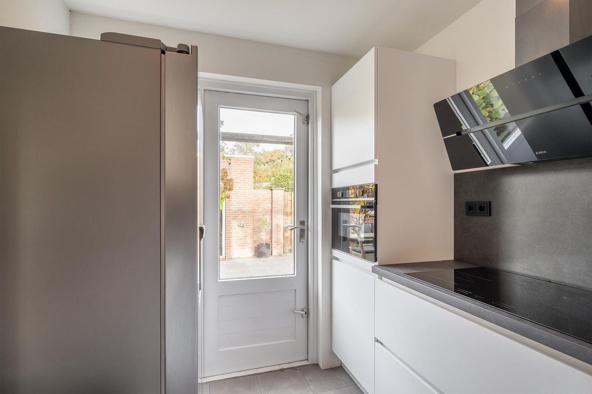 Het keukenblok is in een hoekopstelling geplaatst en uitgerust met een inductiekookplaat, vaatwasser, close-in-boiler, afzuigkap, oven en korfladen. Vanuit de keuken bereik je de achtertuin.
