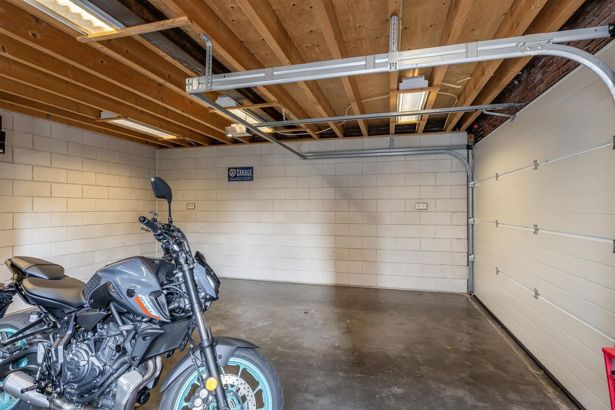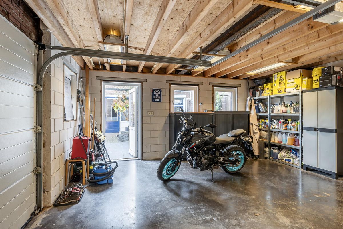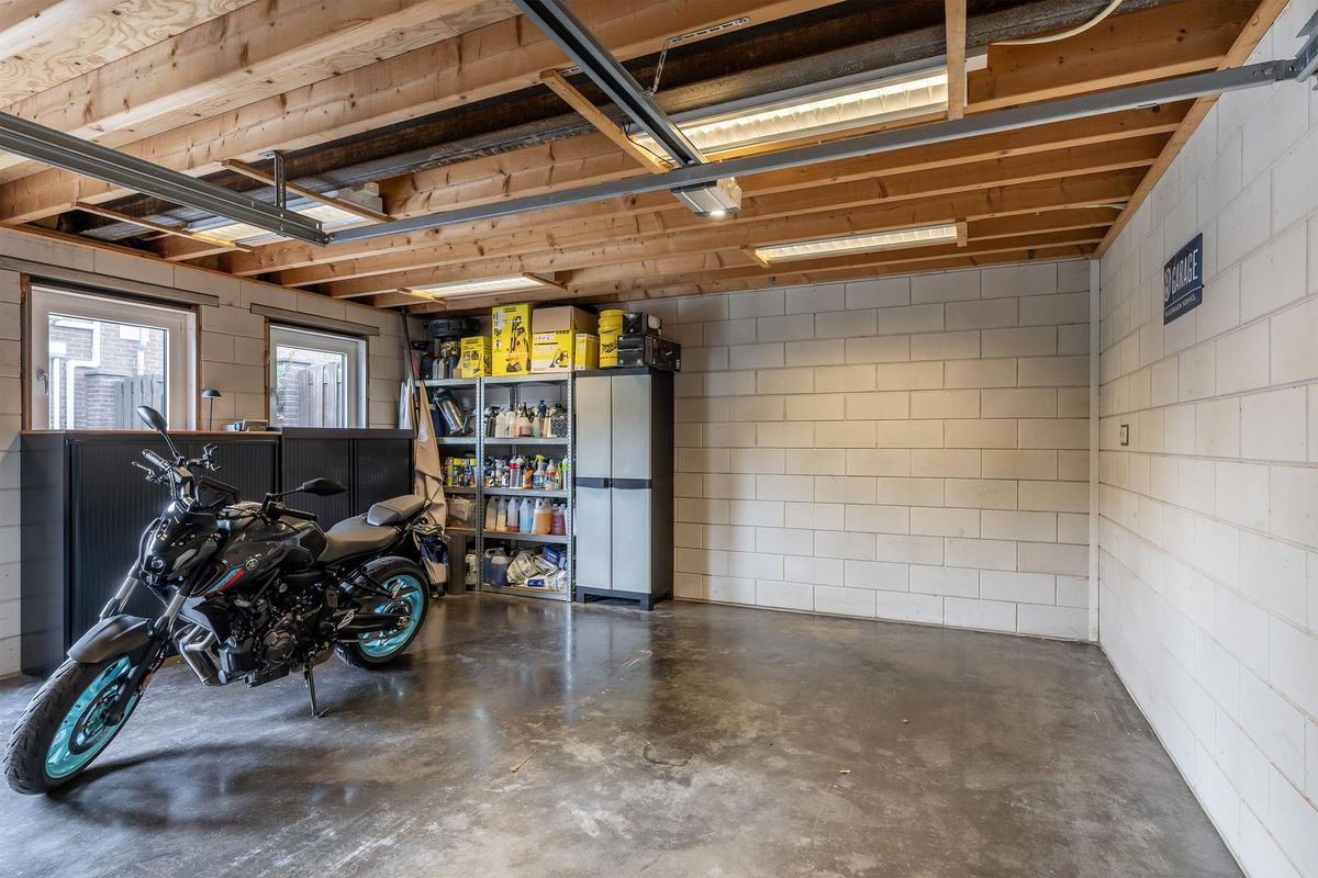 Dubbele geïsoleerde garage met brede oprit, voorzien van een elektrische sectionaaldeur, tuindeur, elektra en een betonnen vloer. Heerlijk veel ruimte voor fietsen, hobby’s, opslag én natuurlijk de auto – zonder gedoe.