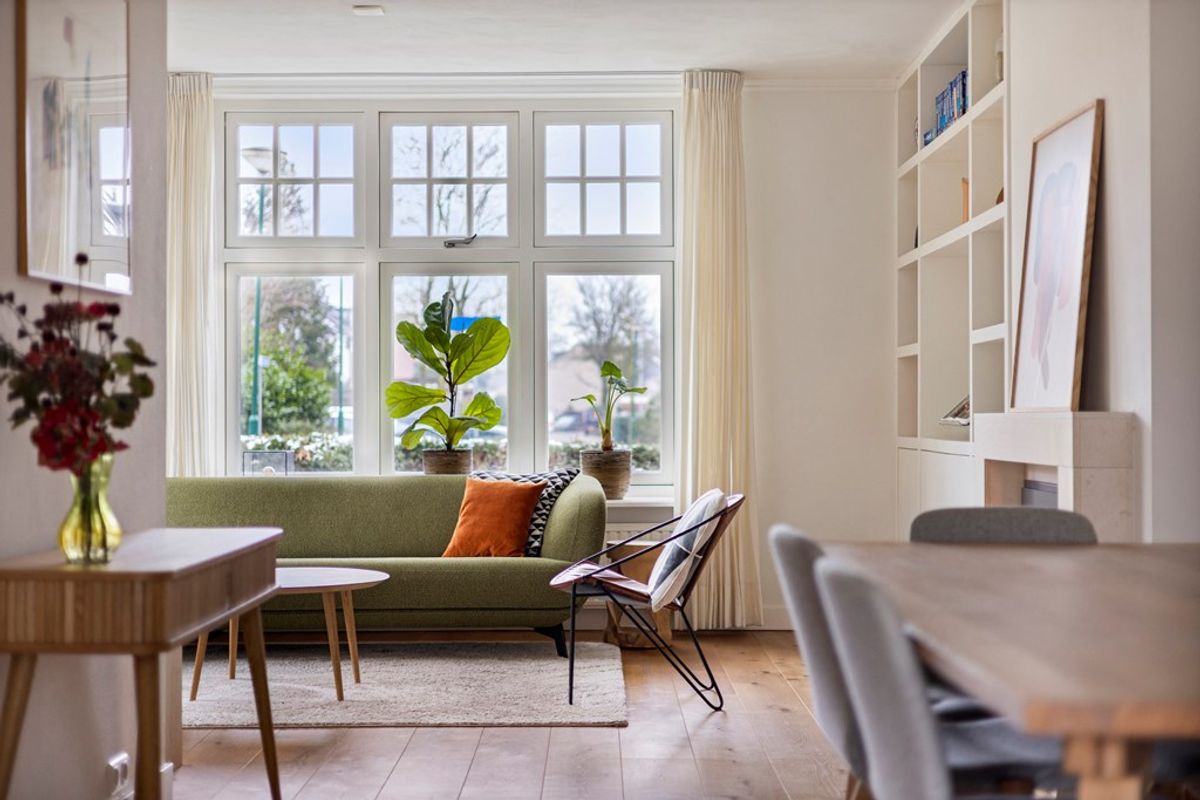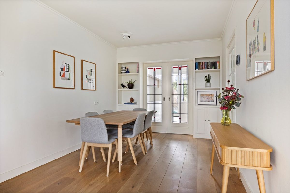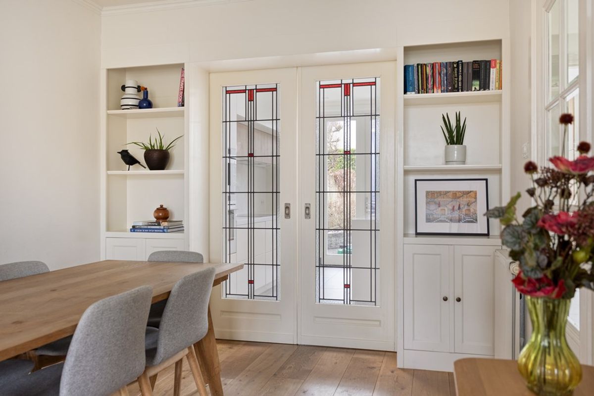 De woonkamer is aan de straatzijde en is een fijne, lichte ruimte met hoge plafonds, gashaard, inbouwkast en een mooie houten vloer. Hier is volop ruimte voor het creëren van een gezellige zithoek en een apart eetgedeelte.. Tussen de keuken en de woonkamer zitten kamer-en-suite deuren met glas-in-lood, wat de woning extra karakter geeft.