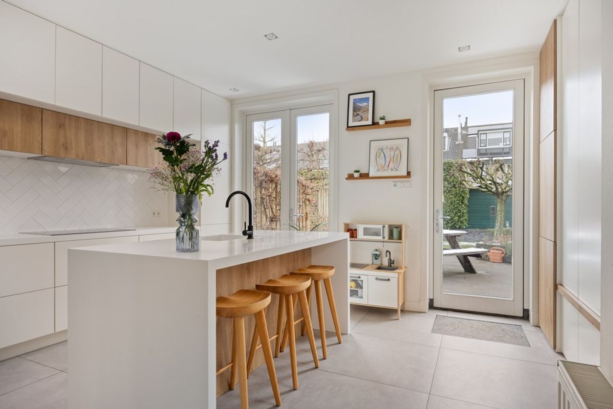 Aan de achterzijde van de woning bevindt zich de, speciaal voor dit huis ontworpen, open leefkeuken, die mooi aansluit op de woonkamer. De keuken is praktisch opgezet met een lang werkblad langs de wand en een spoeleiland met bar, waar je gezellig aan kunt zitten. De keuken is voorzien van een inductiekookplaat, een vaatwasser, een koffiemachine, veel kastruimte, een koelkast en een ingebouwde ovencombinatie. Dit is een fijne plek waar koken, eten en samenzijn moeiteloos samenkomen, met veel licht. Vanwege de openslaande deuren is er direct contact met de tuin.
