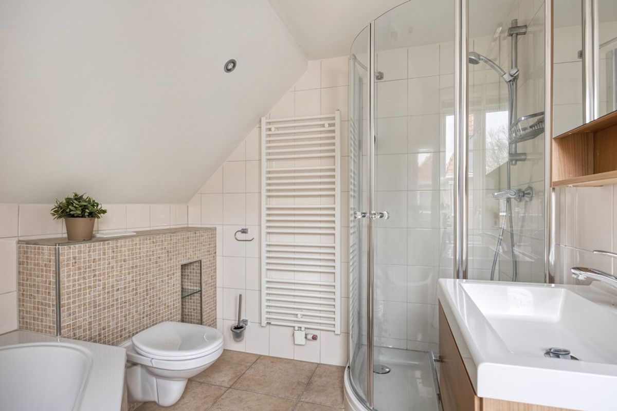 De badkamer grenst aan de overloop en is volledig betegeld. U beschikt hier over een halfronde douchecabine, een wastafel met spiegel en opbergmeubel, een zwevend toilet en een comfortabel ligbad.