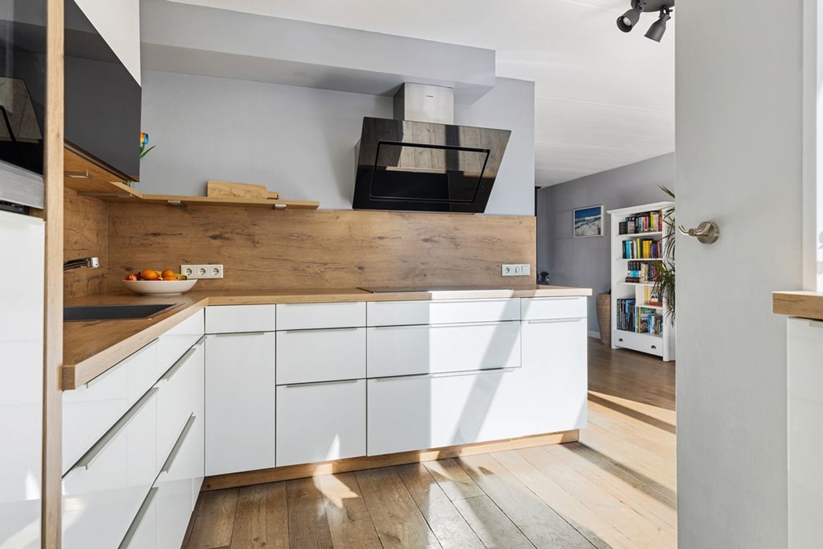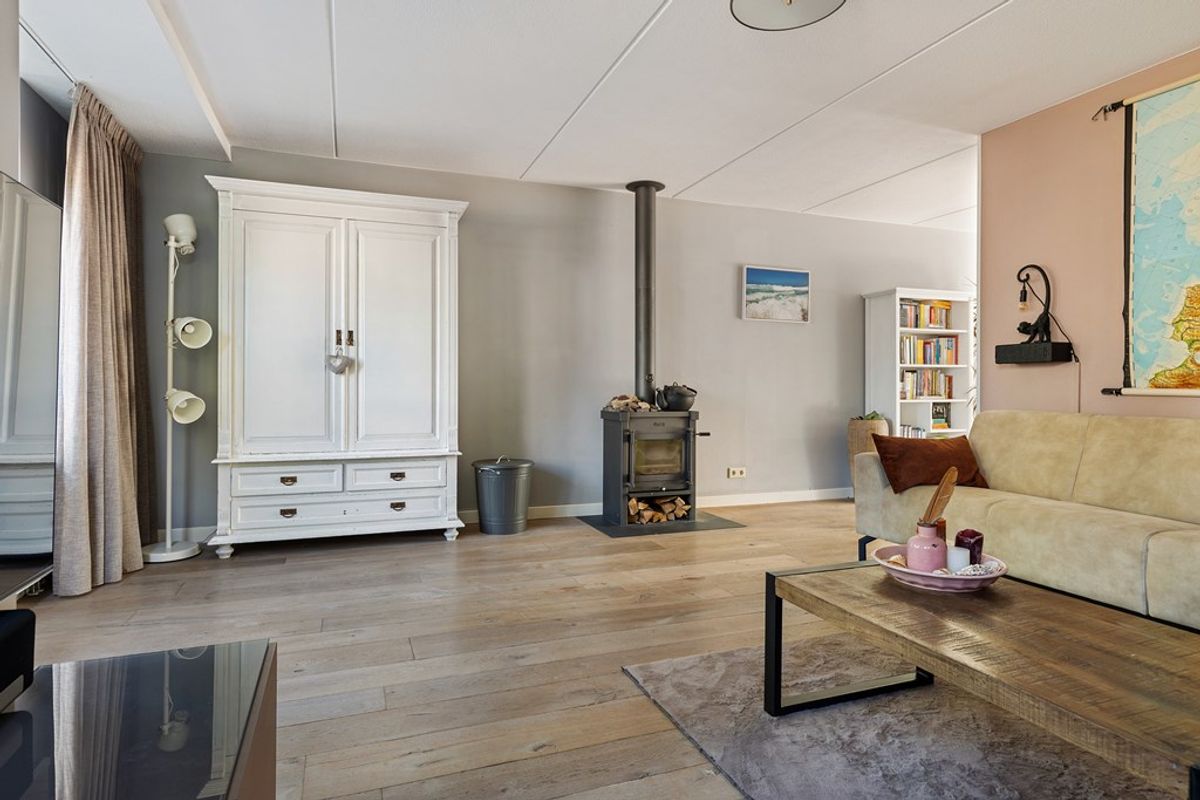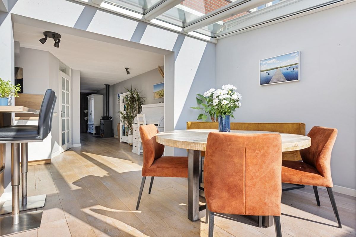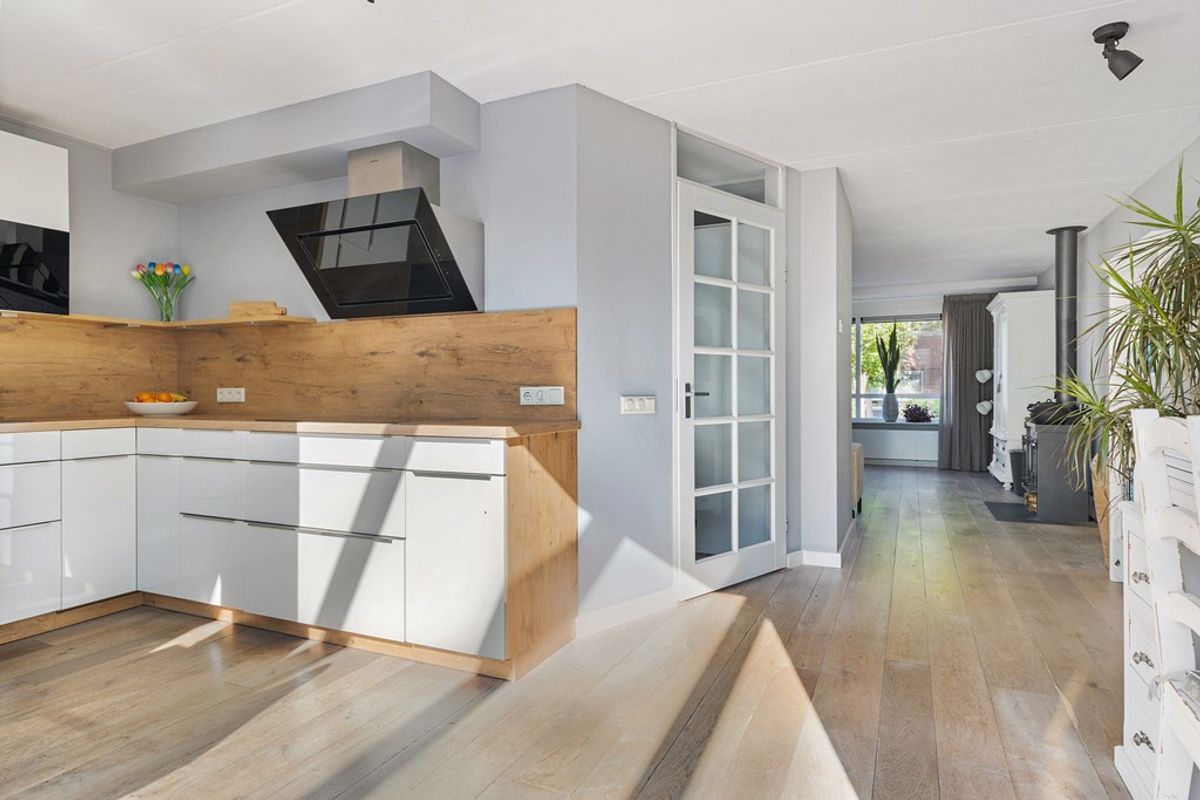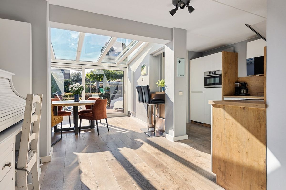 Entree met meterkast en toilet. Ruime, lichte woonkamer met massief eiken vloer en een Jacobus-houtkachel voor extra sfeer. De halfopen keuken is voorzien van een grote inductiekookplaat, vaatwasser, koelkast, vriezer en combi-oven. Aansluitend vind je de volledig geïsoleerde serre (2019) met schuifpui, glazen dak en zonwering, een heerlijke plek om het hele jaar door te genieten van licht en uitzicht op de tuin. Vanuit de bijkeuken (met wasmachineaansluiting) is de volledig geïsoleerde garage (2024) bereikbaar, voorzien van een geïsoleerde deur (2022) en krachtstroom.