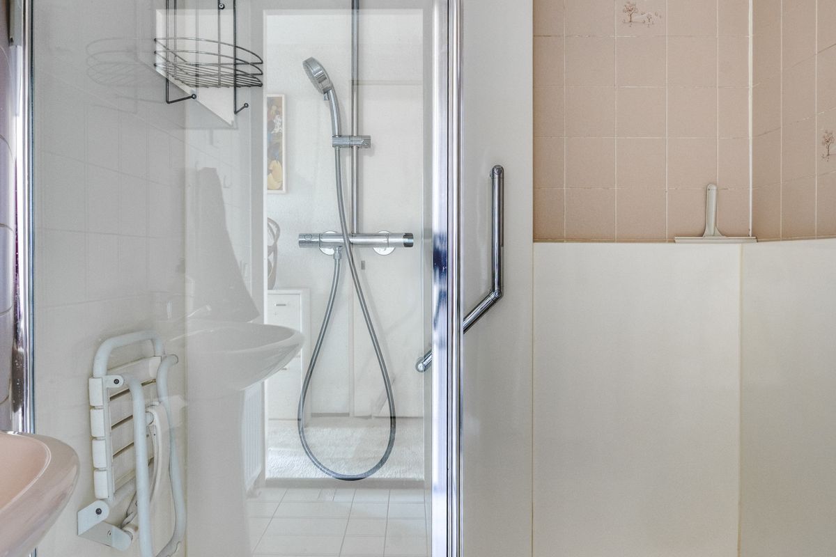 De ruime douche is voorzien van een douchestang met handdouche, thermostaatkraan en er zijn veiligheidsvoorzieningen aangebracht.
