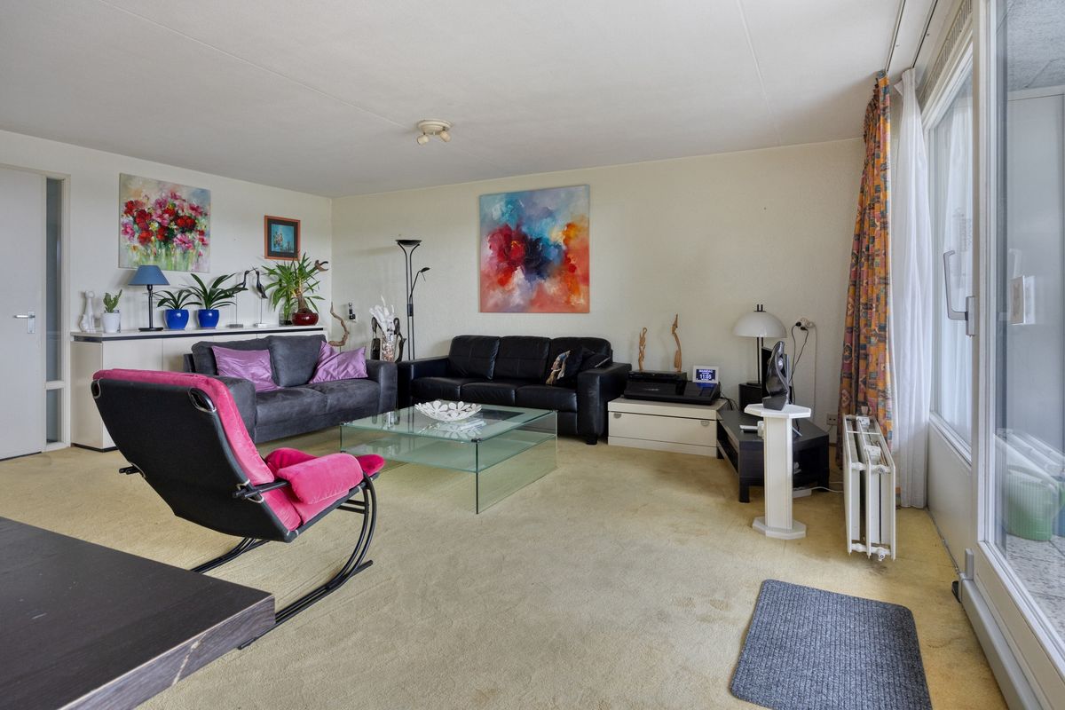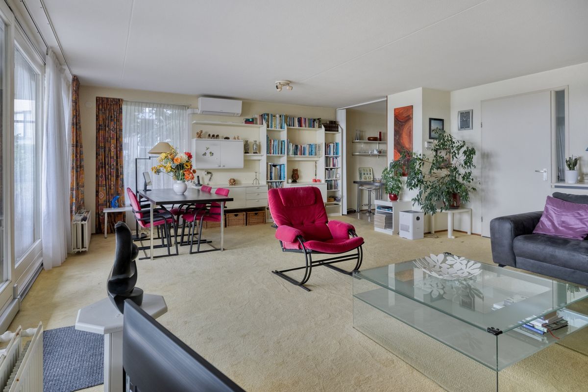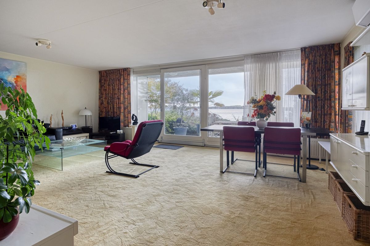 Dan komen we de woonkamer binnen en daar wordt u gelijk getrakteerd op het geweldige uitzicht op het Wolderwijd. Via de schuifpui is het terras toegankelijk waar u meer dan voldoende ruimte heeft voor een gezellige zit om van dit uitzicht te genieten. Doordat er op de hoek een glazen windscherm is geplaatst, zit u hier op elk moment van de dag lekker beschut. Mocht u het in de zon iets te warm krijgen, dan zorgt het zonnescherm voor de nodige schaduw. Op het terras is ook een vaste bergkast, handig voor uw tuinspullen.