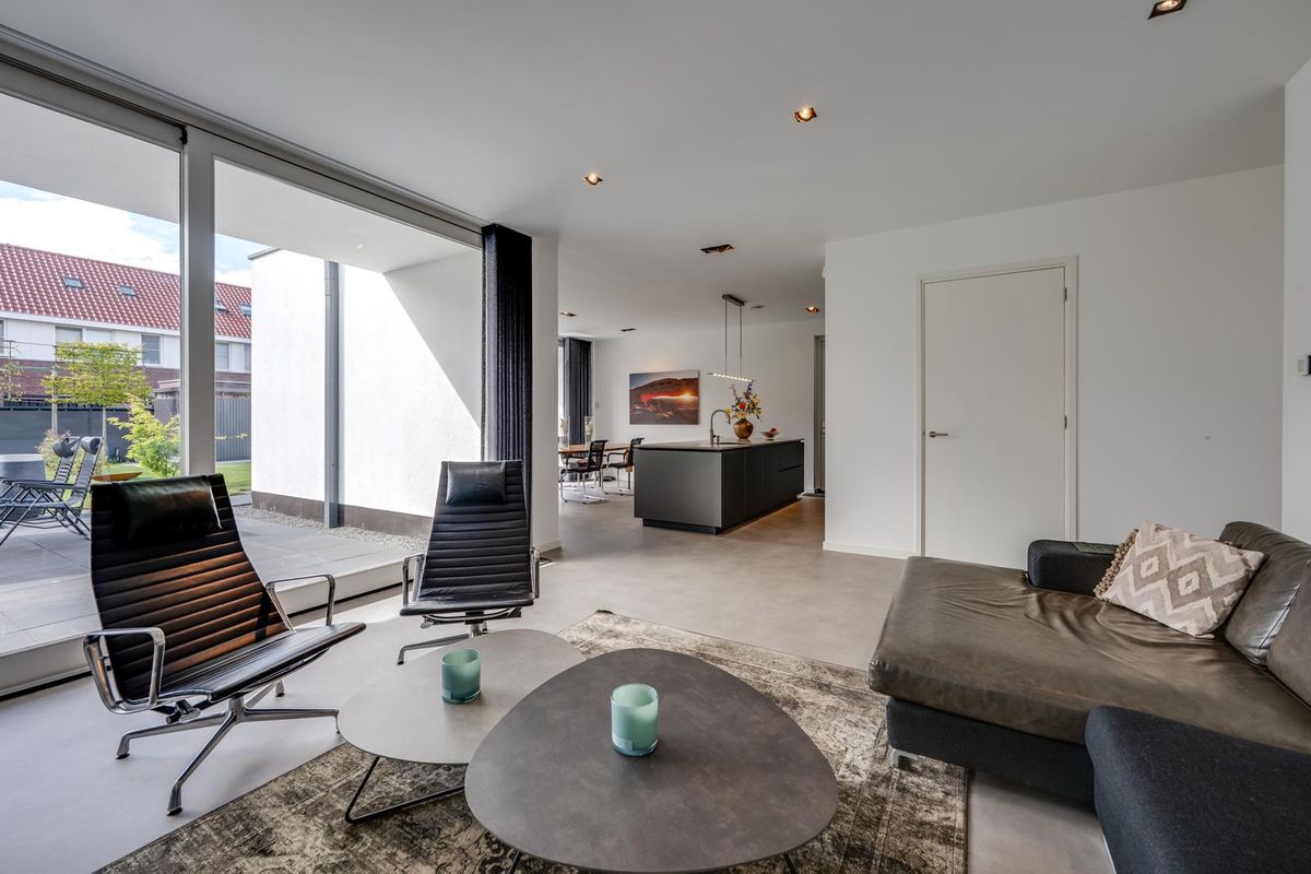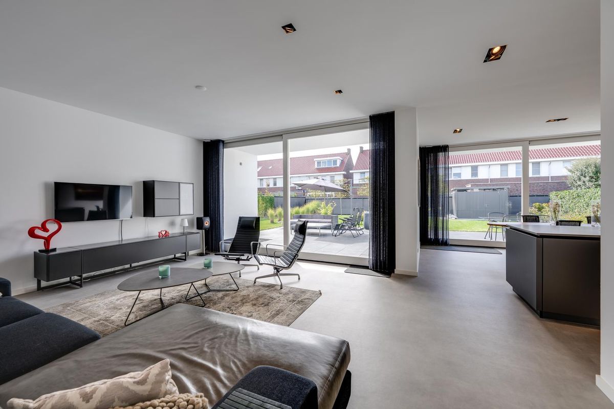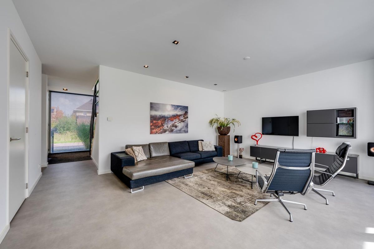 Tuingerichte ruime woonkamer met betonlook afgewerkte vloer met vloerverwarming, schuifpui naar de achtertuin. Aan de achterzijde van de woonkamer is de open keuken gelegen.