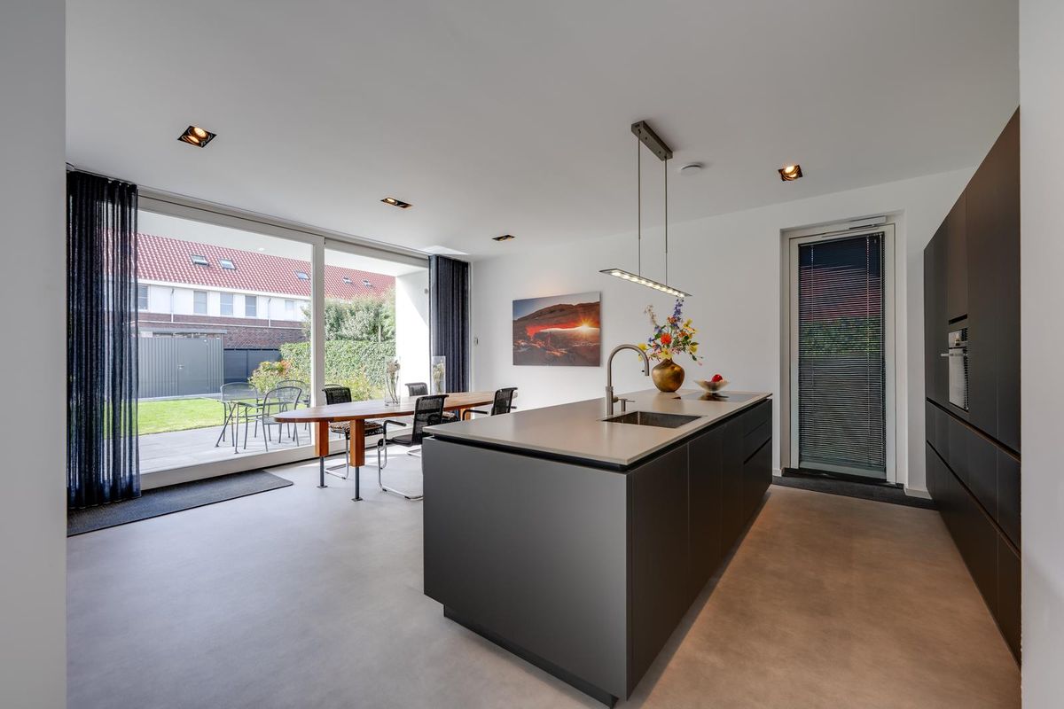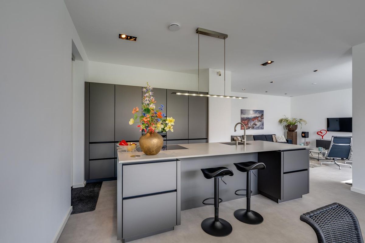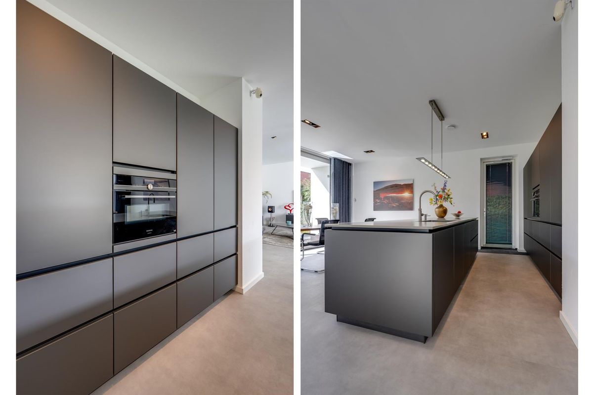 Open luxe keuken met een in wand opgestelde keukeninrichting met diverse inbouwapparatuur. Een kookeiland met spoelen, Bora kookplaat en een vaatwasser. Vanuit de keuken is er een fraai uitzicht op de achtertuin die u middels een schuifpui kunt betrekken bij de keuken (in- outdoor living). Deze open keuken is perfect voor gezellige avonden of voor het ontvangen van gasten.